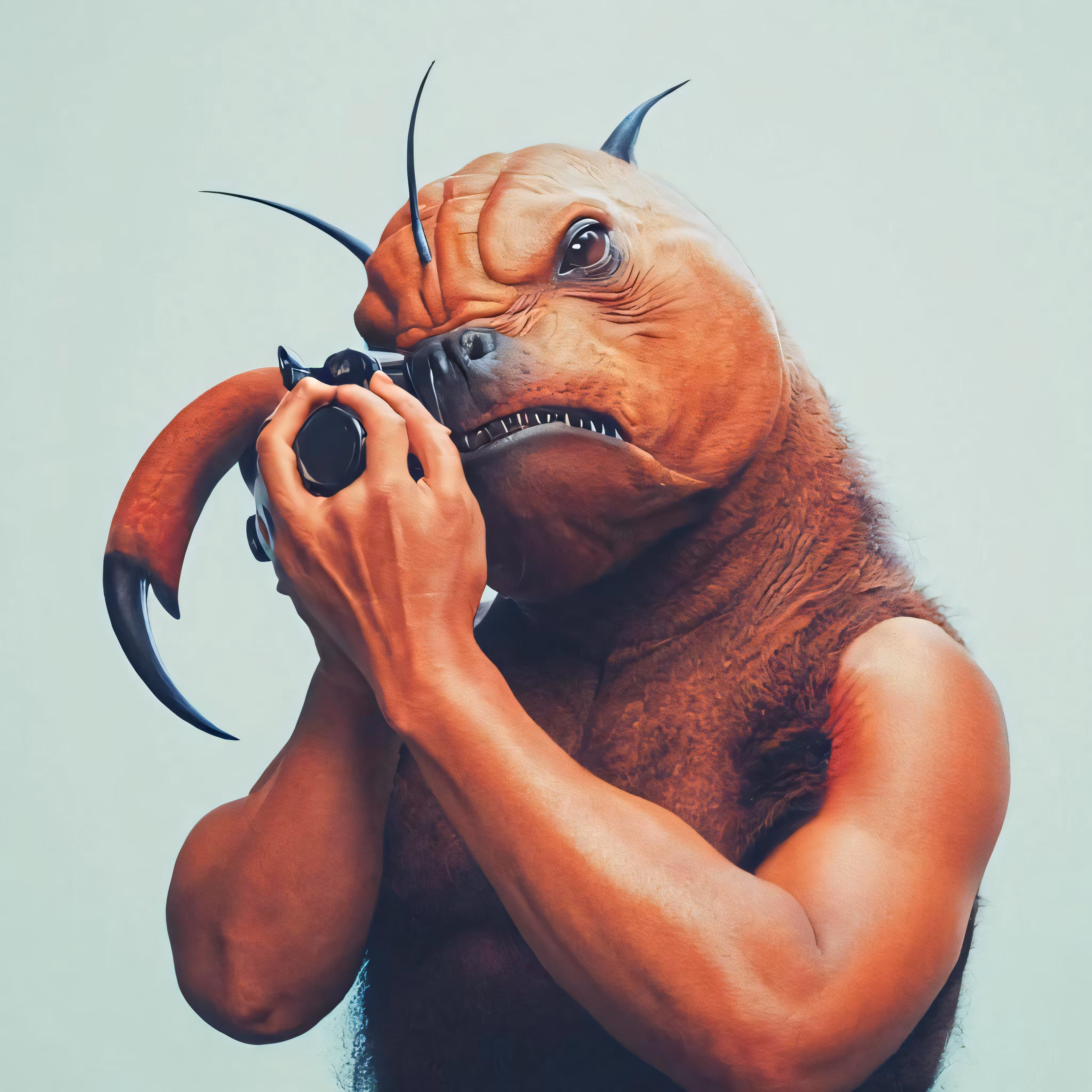 High resolution picture, free to use, an ugly, creature is holding a digital camera
