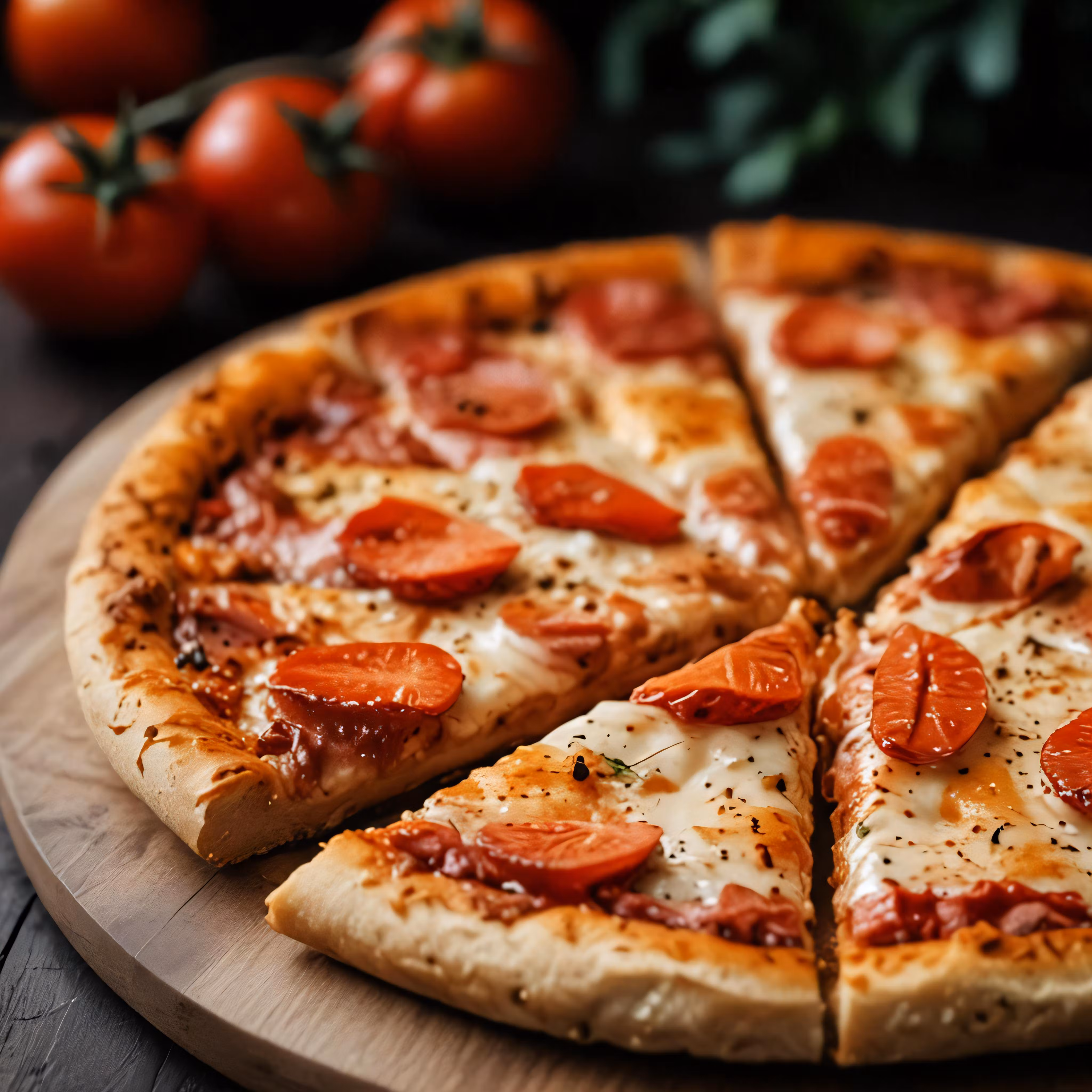 High resolution picture, free to use, an uncut pepperoni pizza with various slices arranged around it