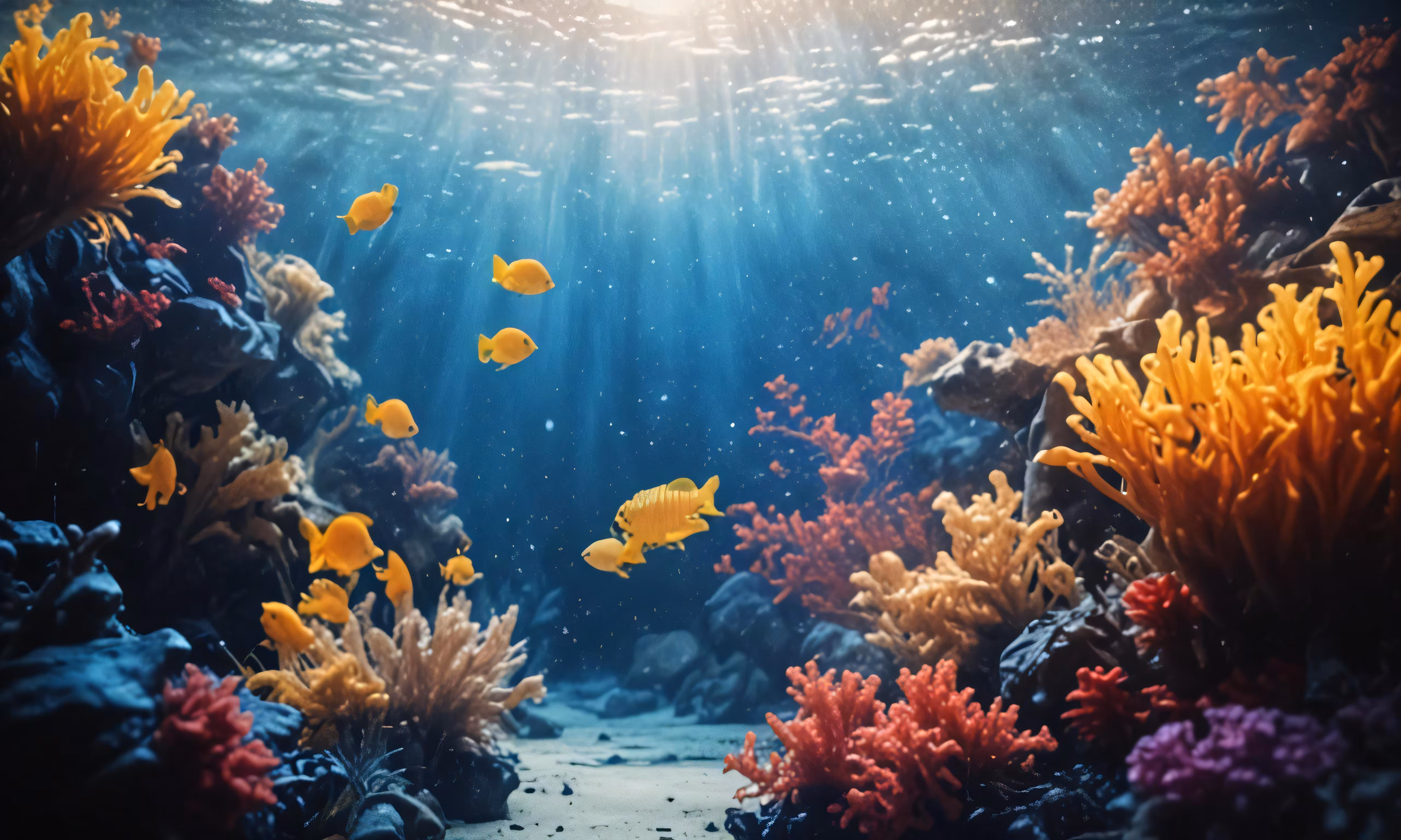 High resolution picture, free to use, an underwater scene with orange fish and reef vegetation