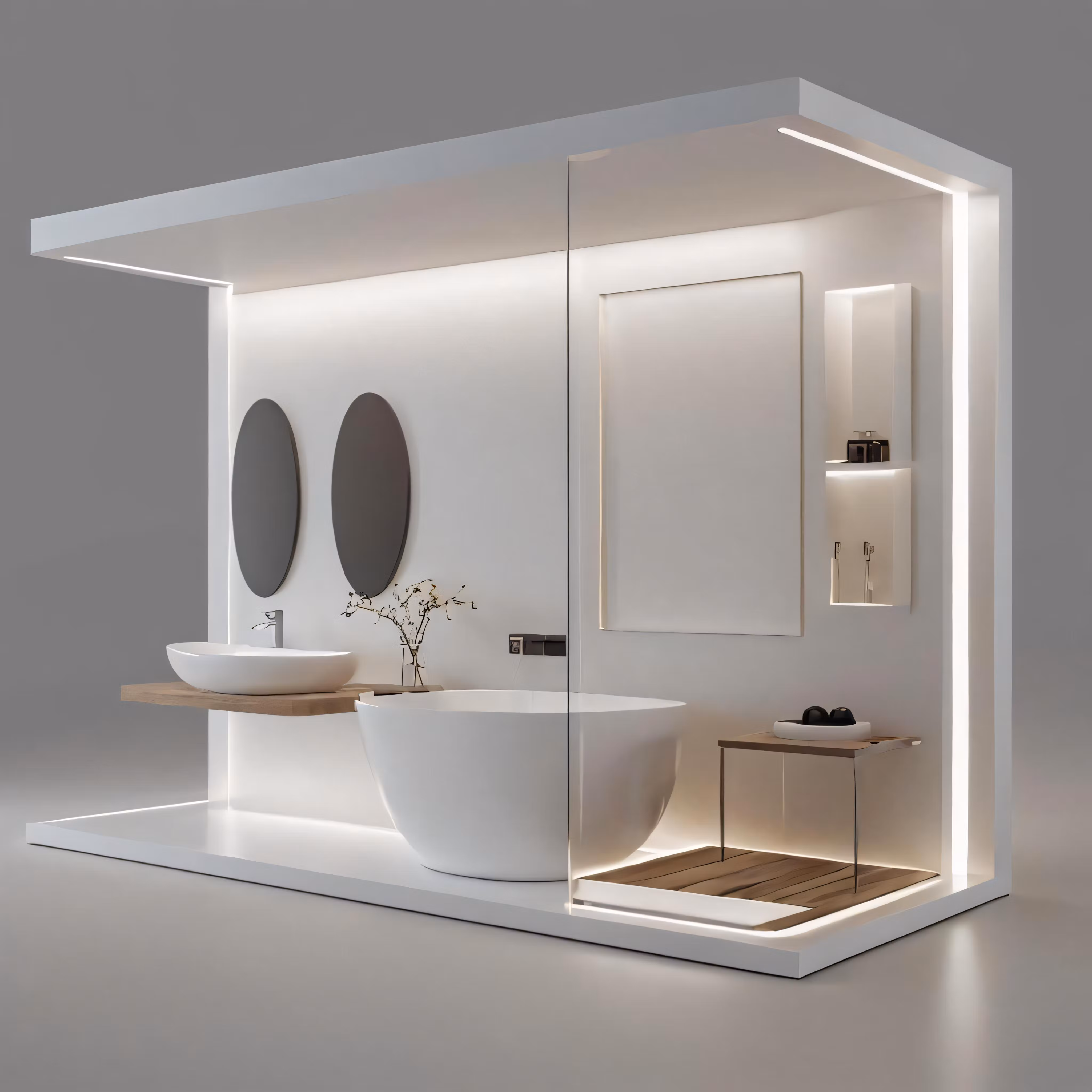 High resolution picture, free to use, an unusual bathroom with a large white bathtub