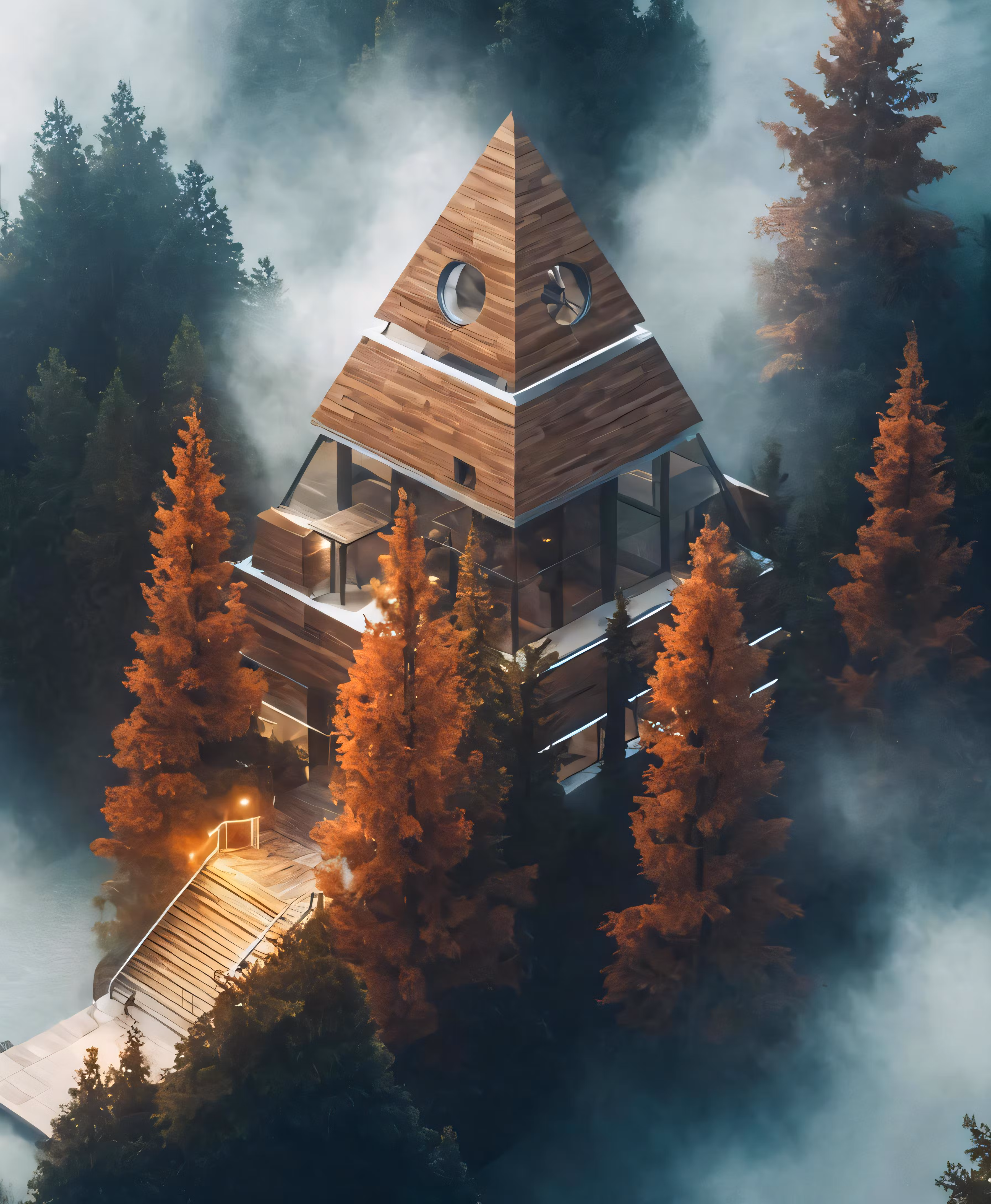 High resolution picture, free to use, an unusual house surrounded by fog and trees