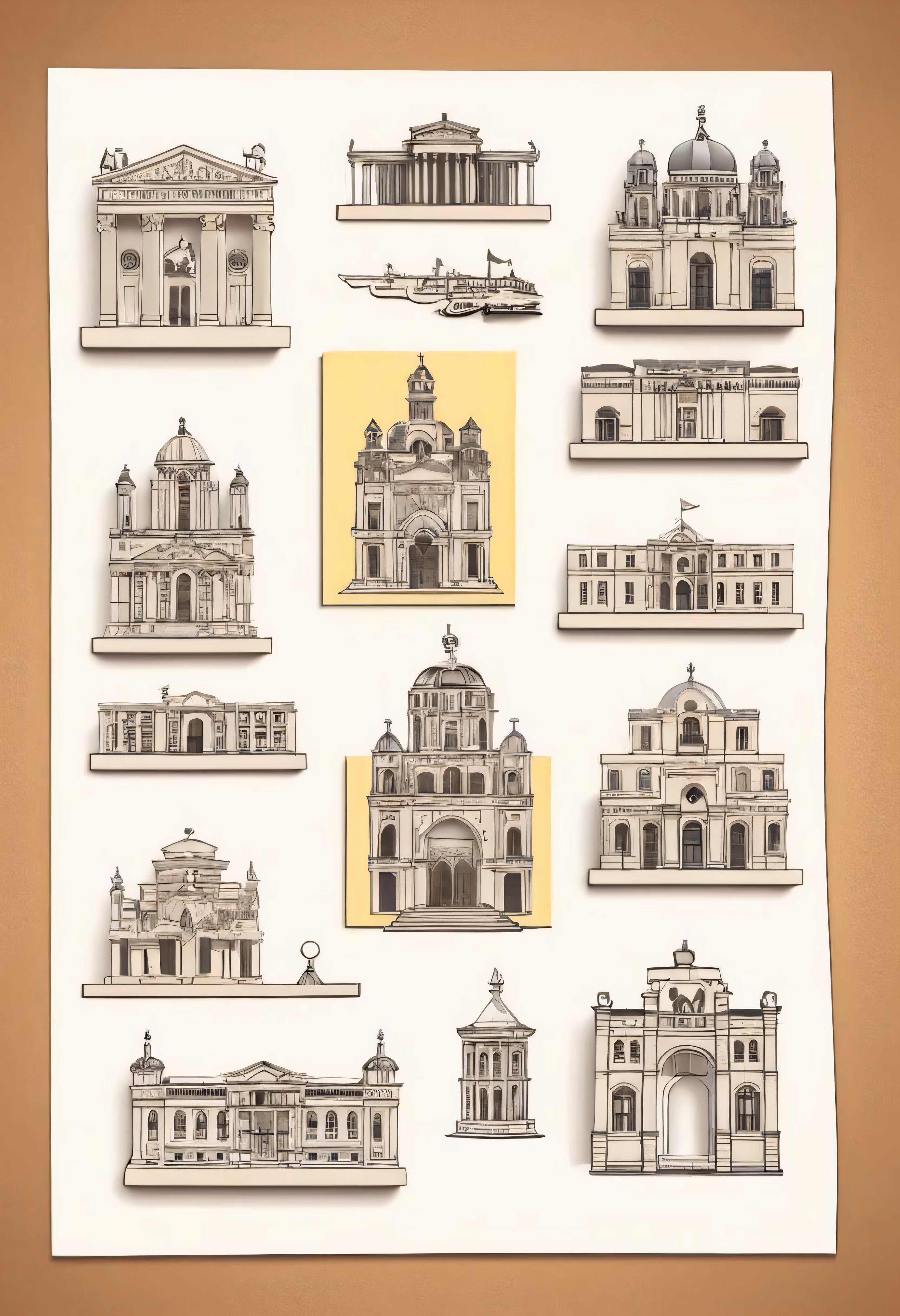 High resolution picture, free to use, architectural drawings from different buildings on display in a display