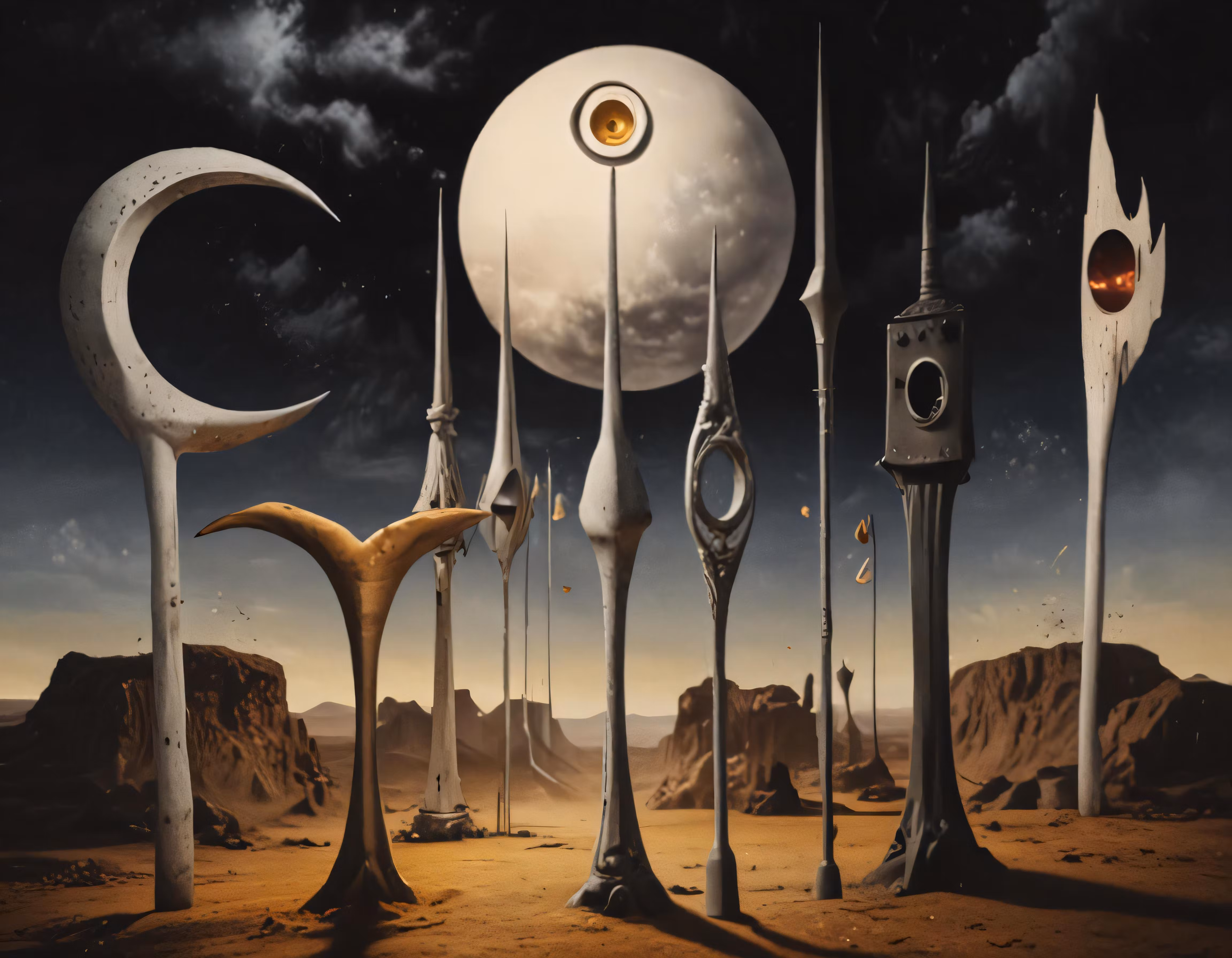 High resolution picture, free to use, artwork depicting strange things in the desert on a dark night