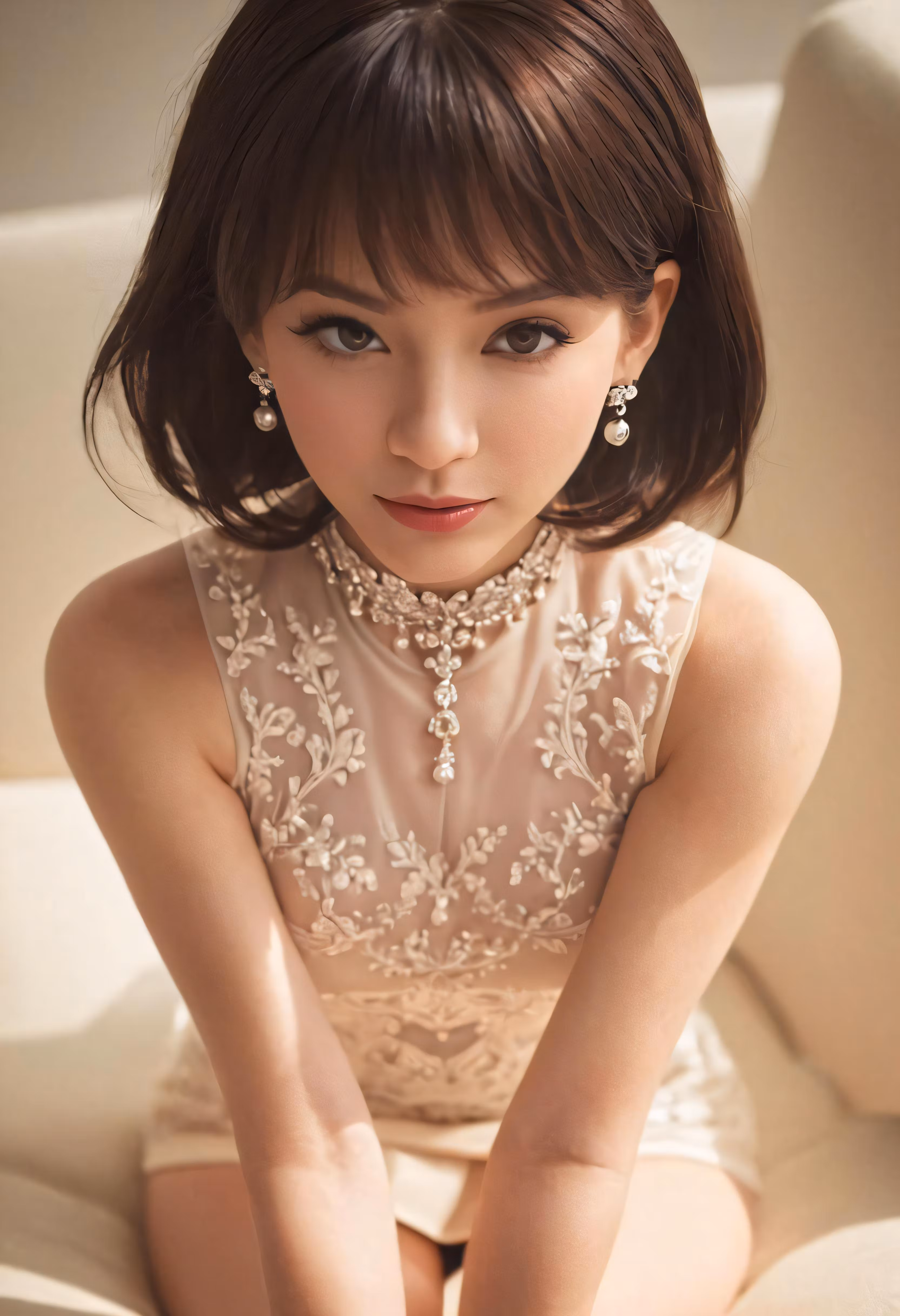 High resolution picture, free to use, asian girl in dress sitting on couch wearing pearls