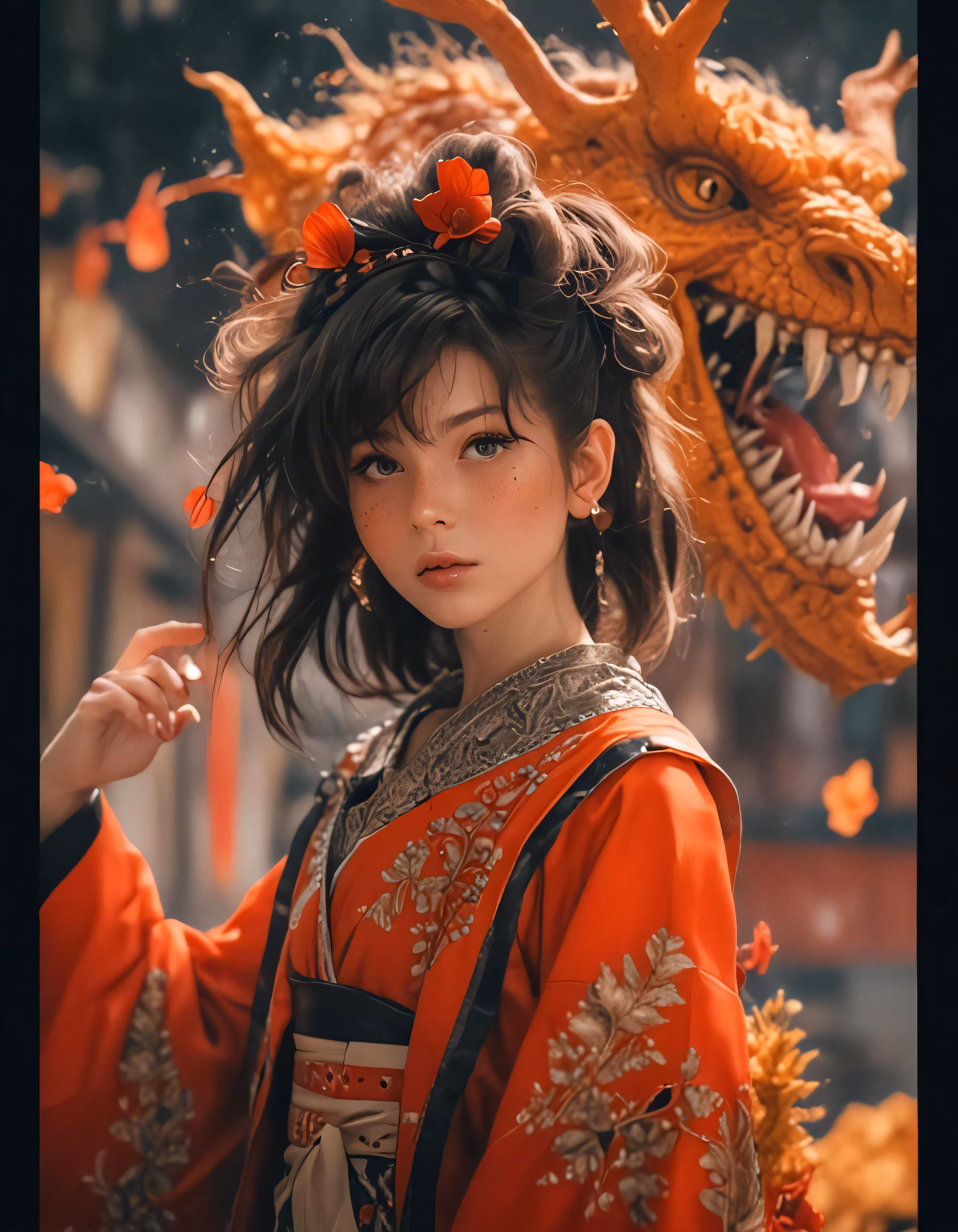High resolution picture, free to use, asian lady posing for photo with dragon head behind her