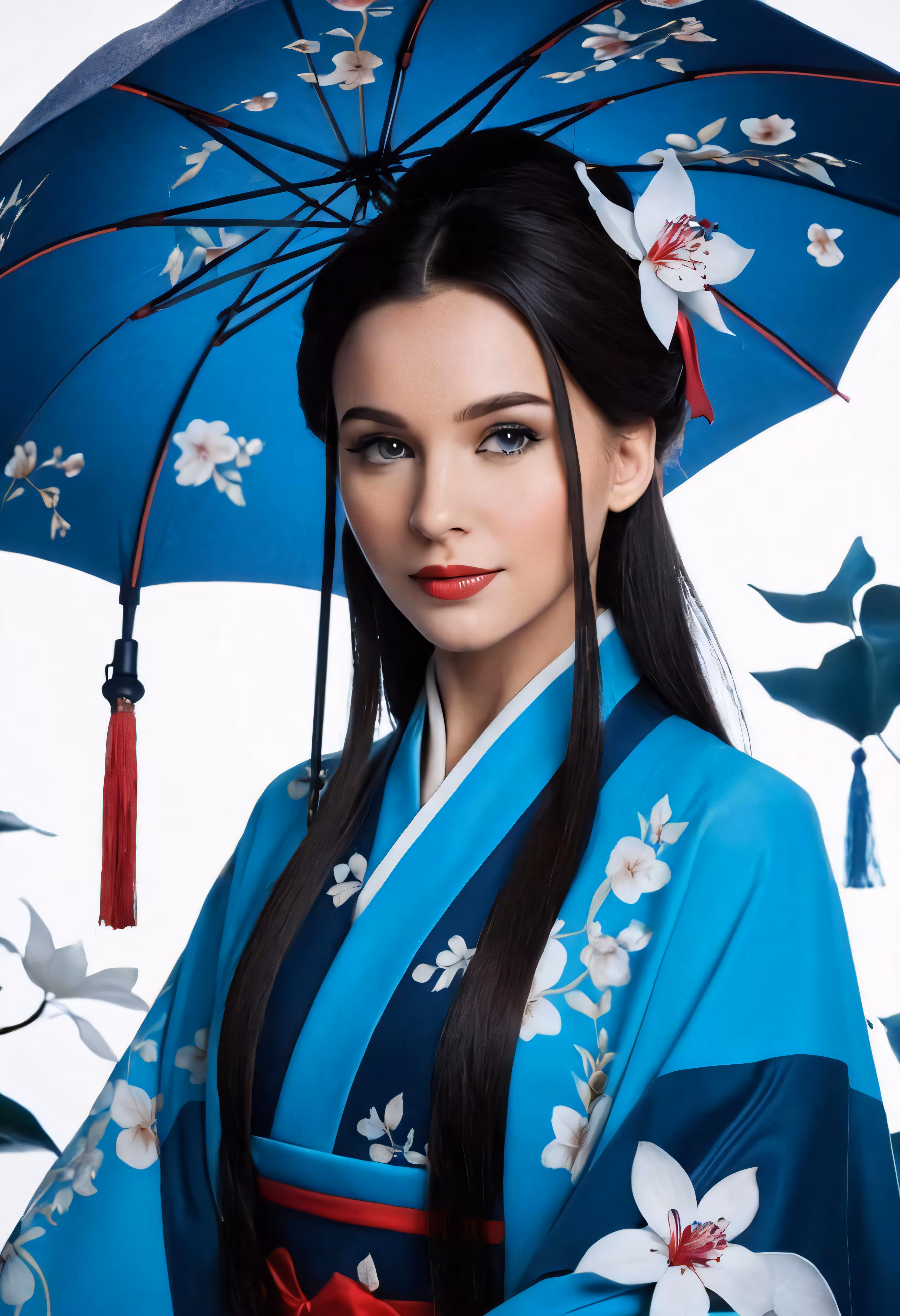 High resolution picture, free to use, asian woman with long hair, in a blue kimono and holding an open red umbrella