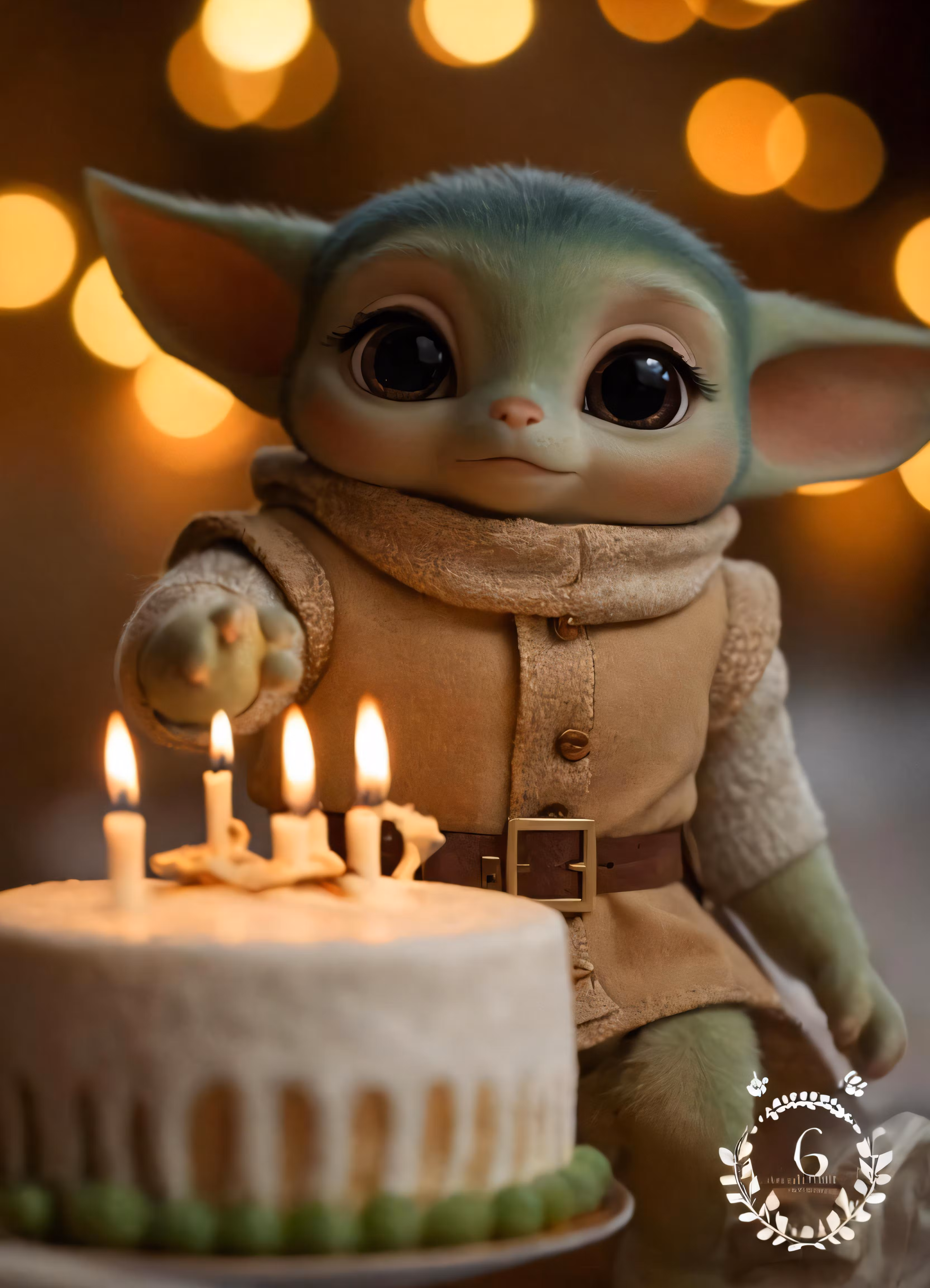 High resolution picture, free to use, baby yoda with lit candles on a cake