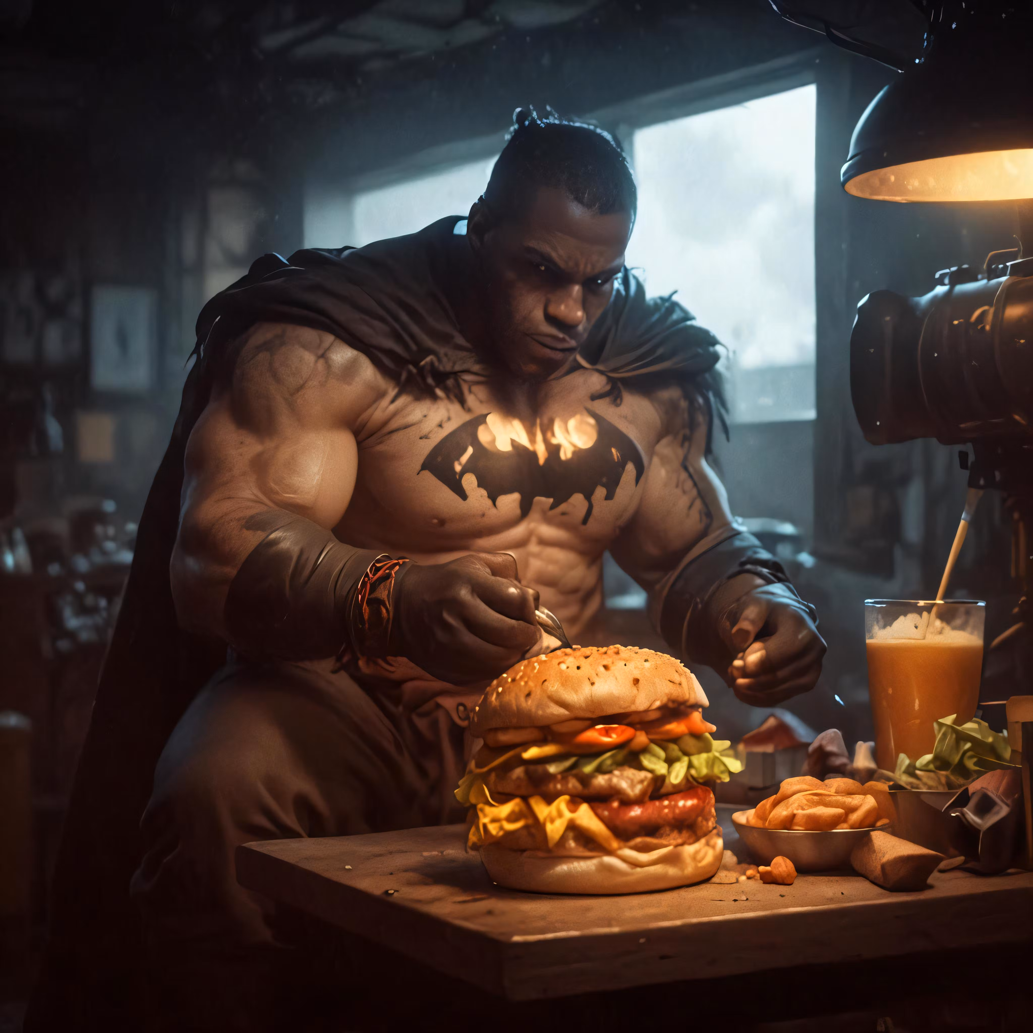 High resolution picture, free to use, batman returns the caped crusader making his hamburger