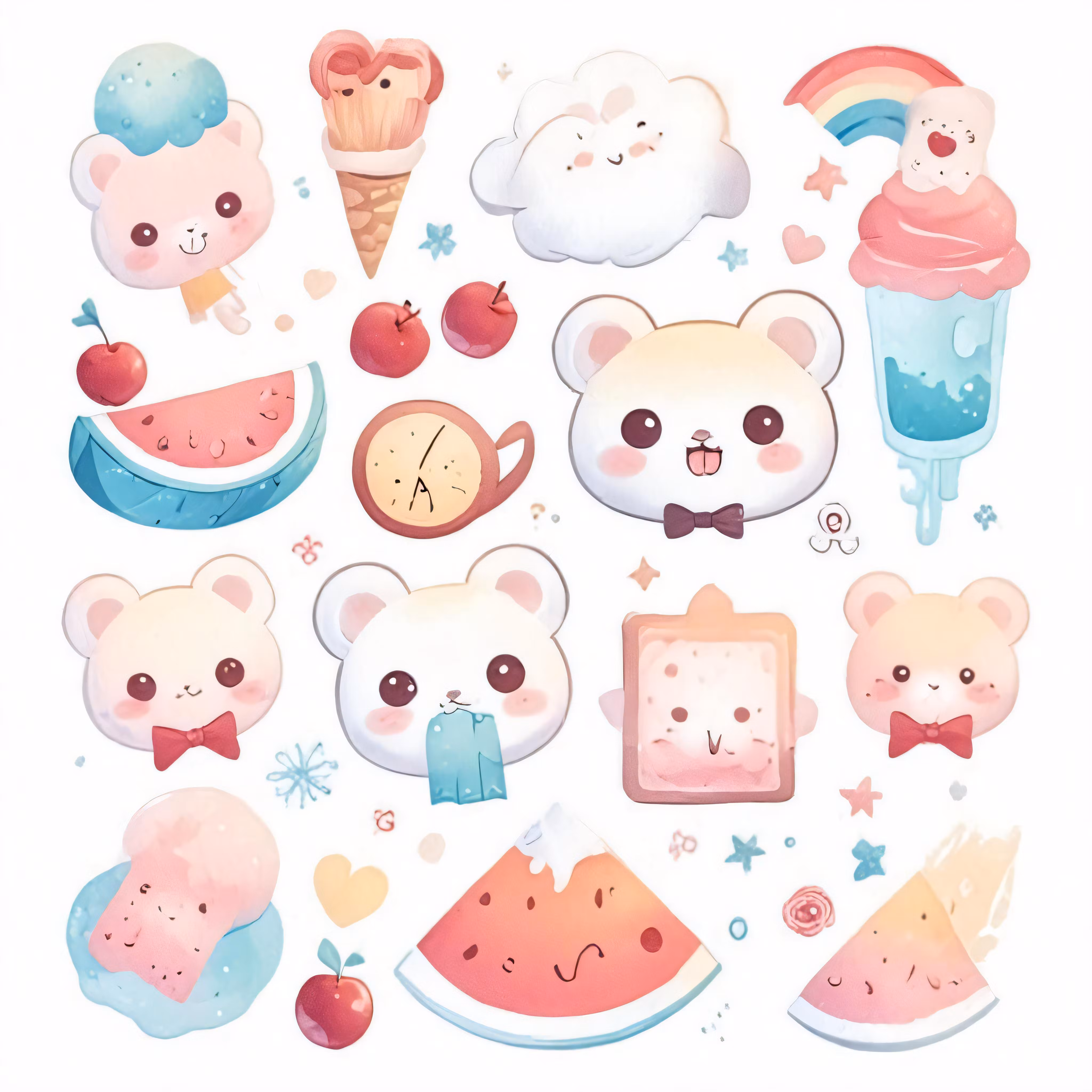 High resolution picture, free to use, bear and apple icons, including a clock, a cat and watermelon