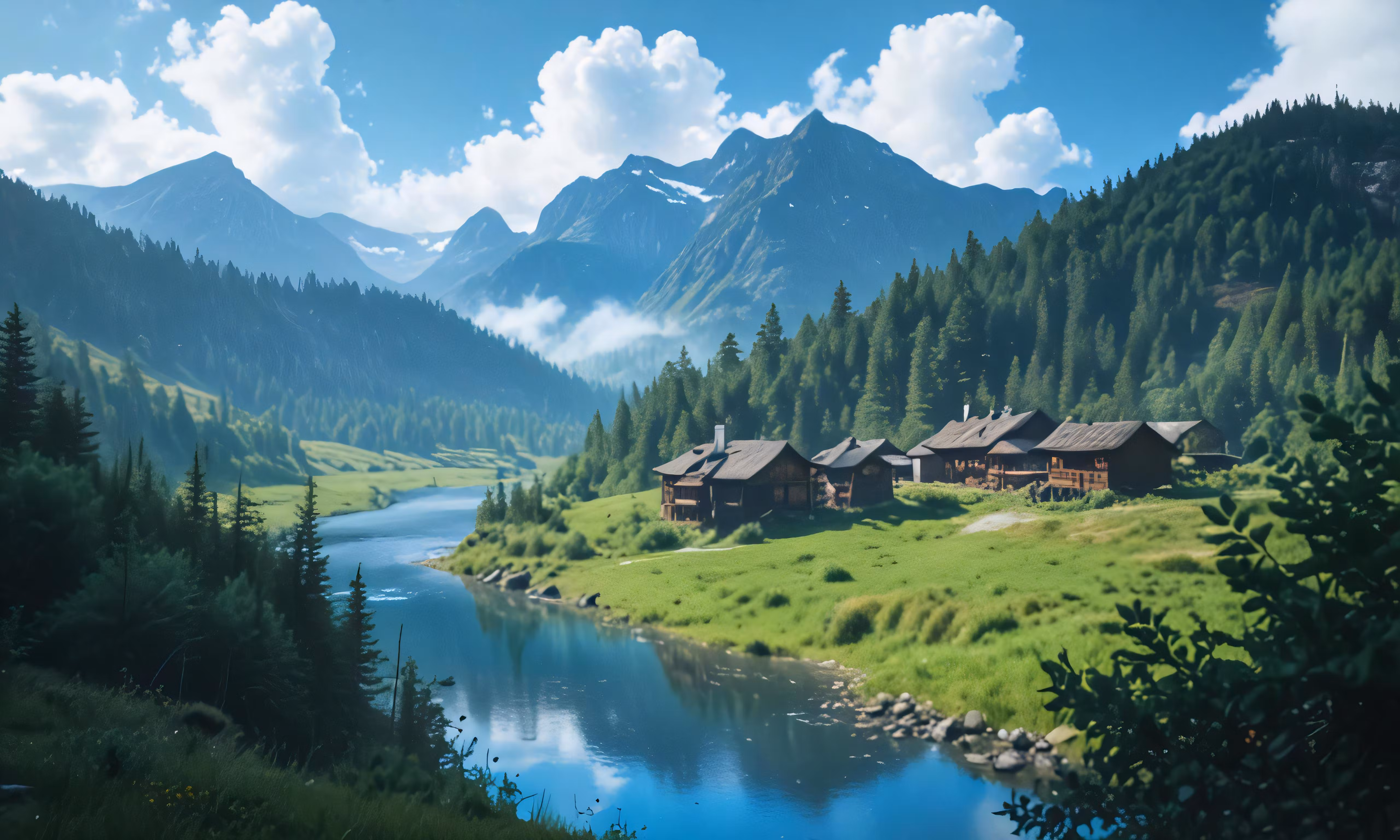 High resolution picture, free to use, beautiful landscape with clouds, mountains, water and green grass