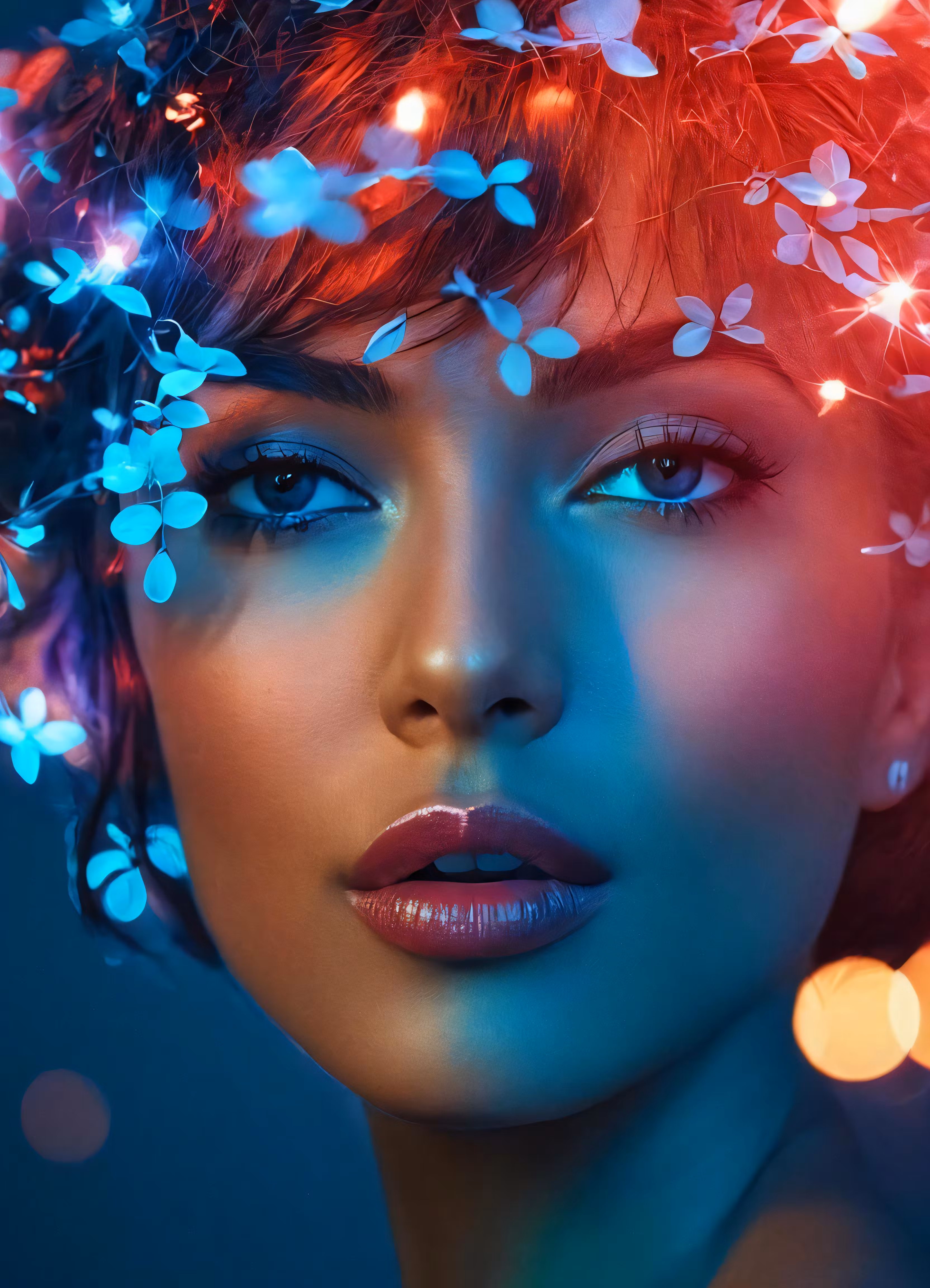 High resolution picture, free to use, beautiful young woman with blue eyes with many petals around her head