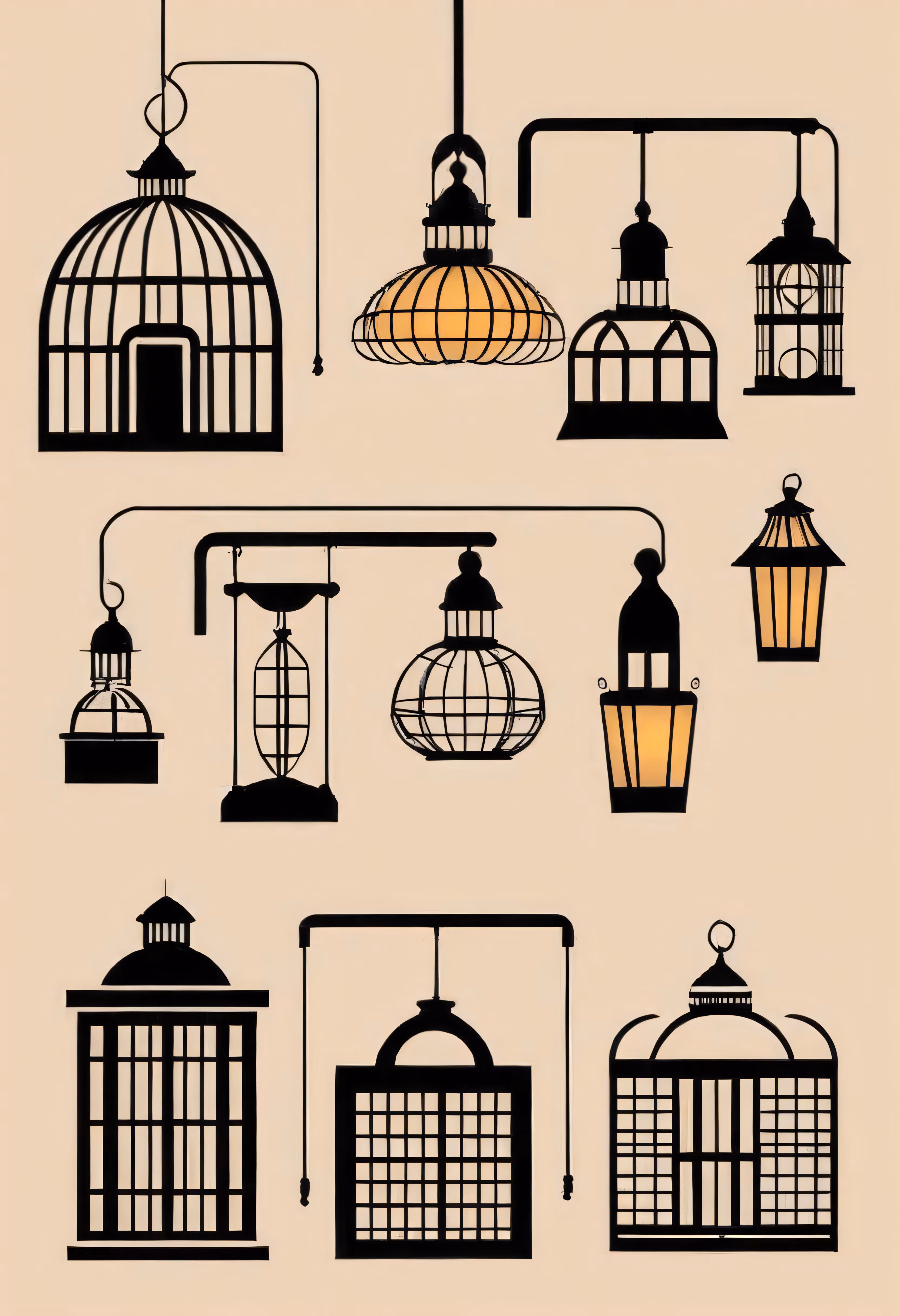 High resolution picture, free to use, black and white caged lights hanging above an open room