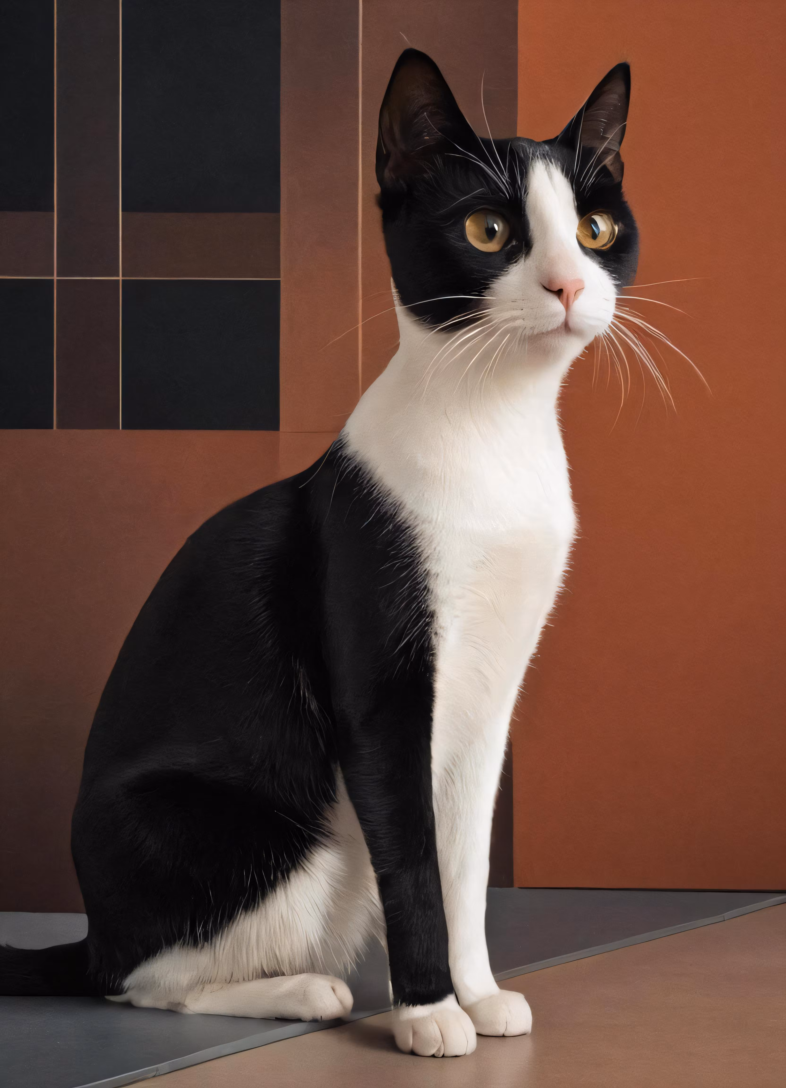 High resolution picture, free to use, black and white cat sitting down looking back