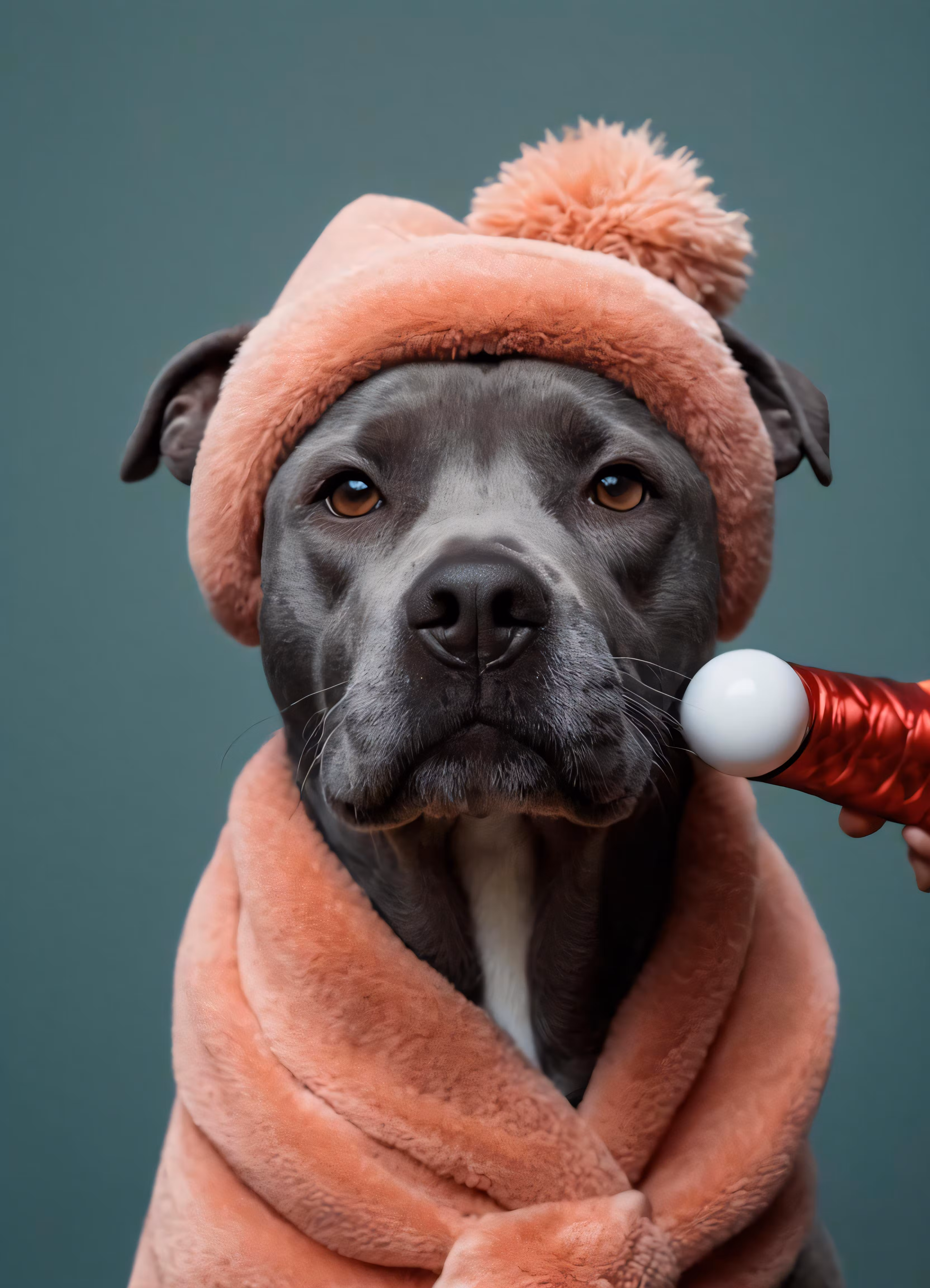 High resolution picture, free to use, black and white dog wearing pink clothing with a red hat and a pink shawl
