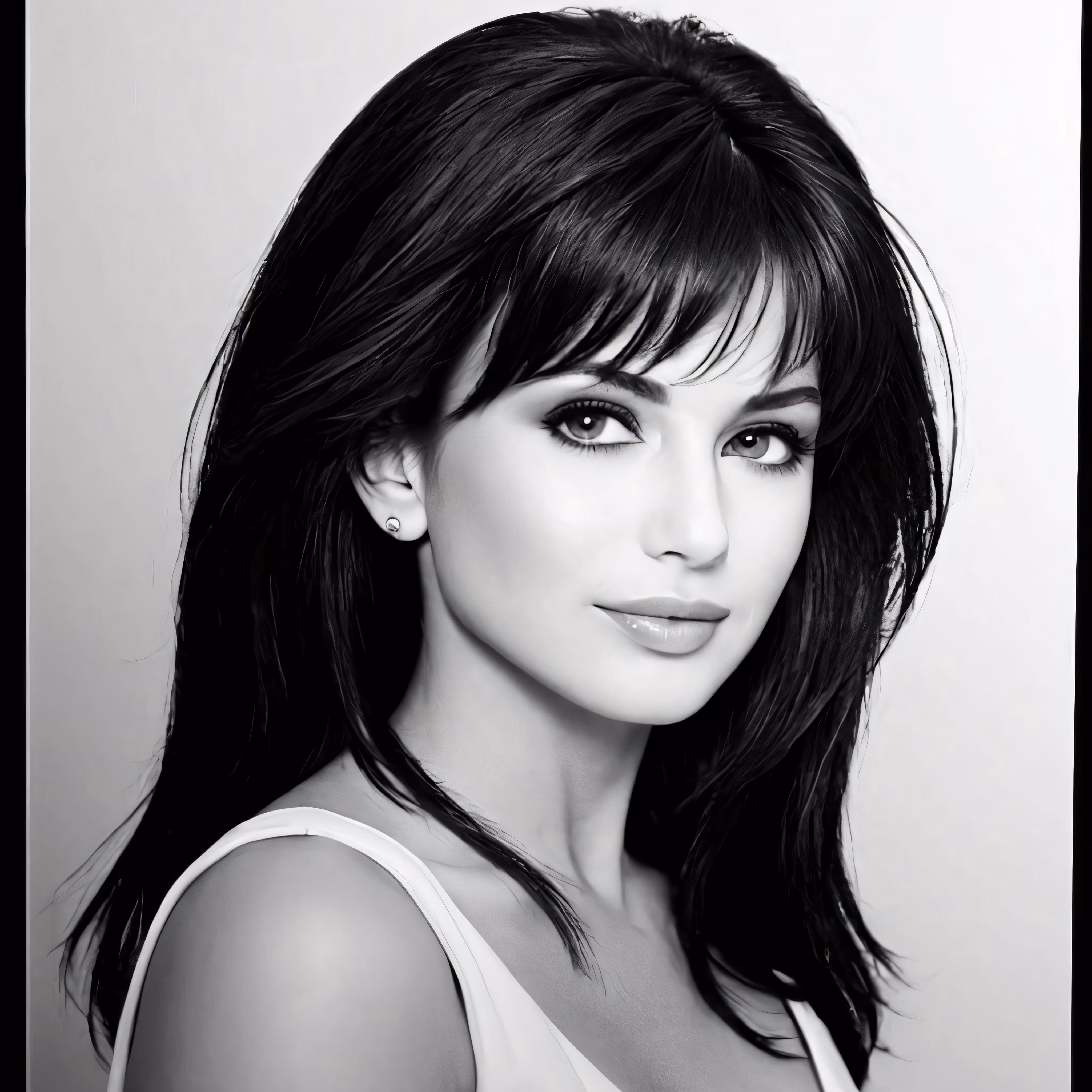 High resolution picture, free to use, black and white photo of a beautiful woman with bangs