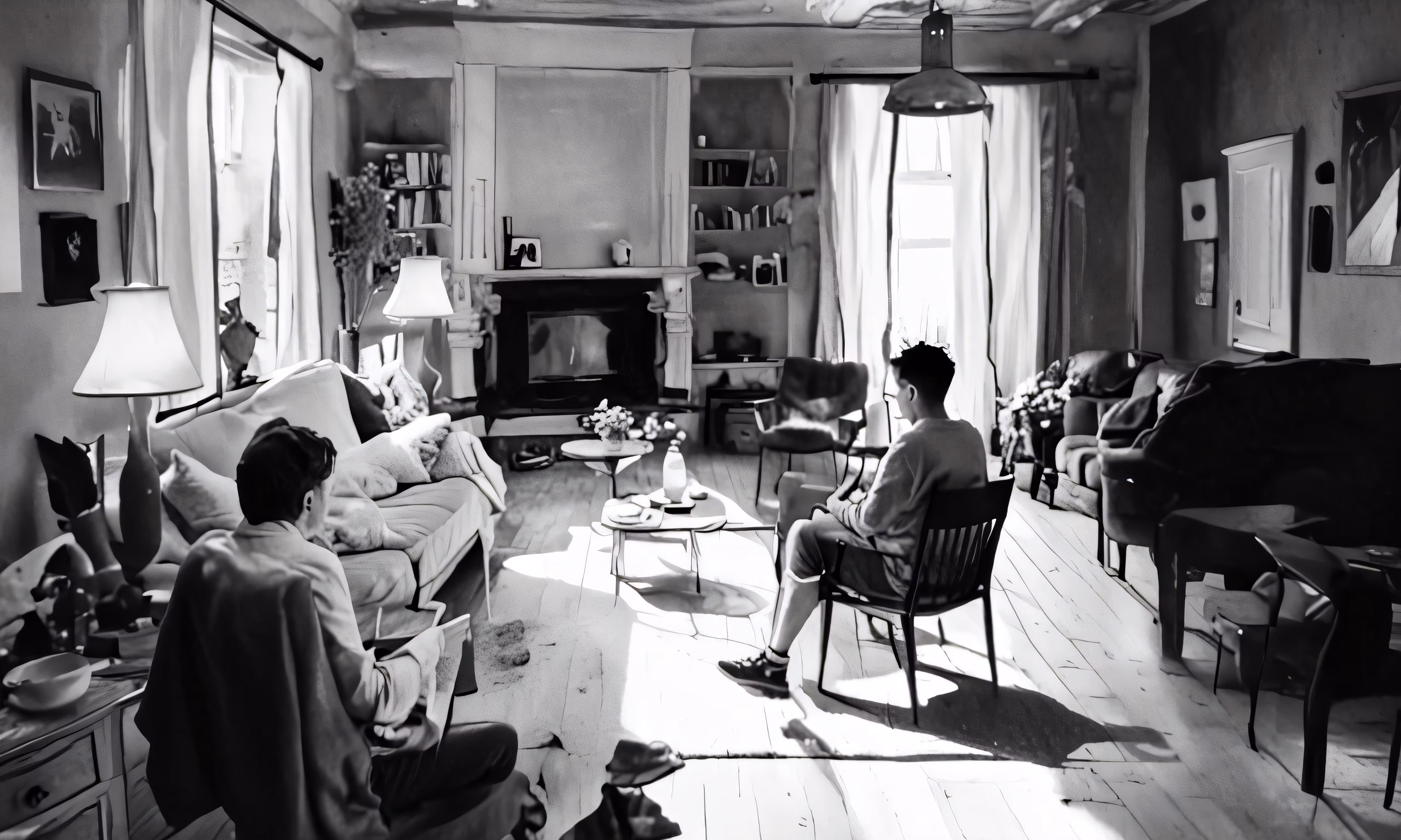 High resolution picture, free to use, black and white photo of a woman sitting in her living room
