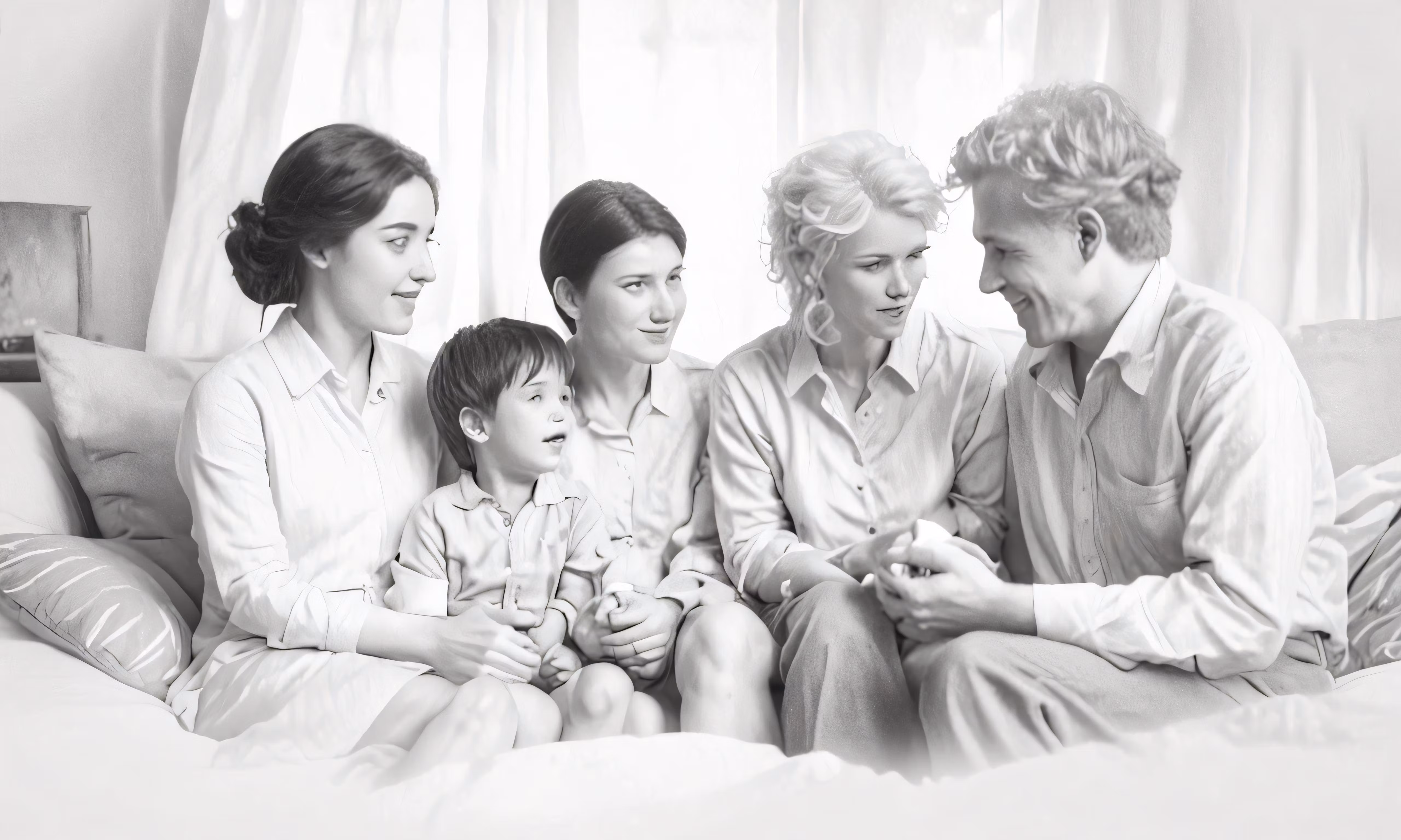 High resolution picture, free to use, black and white photo of three family members sitting in bed