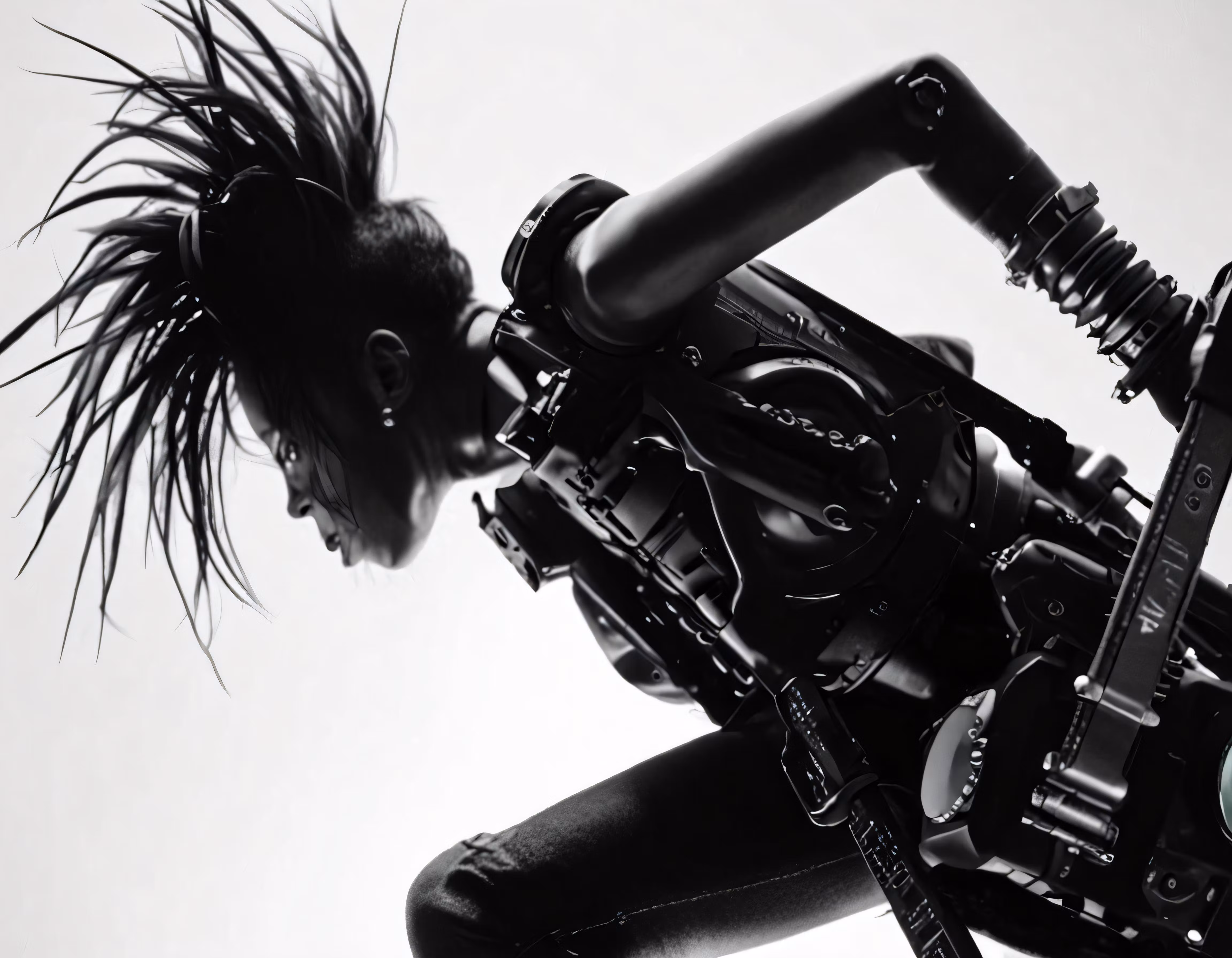 High resolution picture, free to use, black and white photo of woman wearing all black clothing and leather pants with punk hair on motorcycle