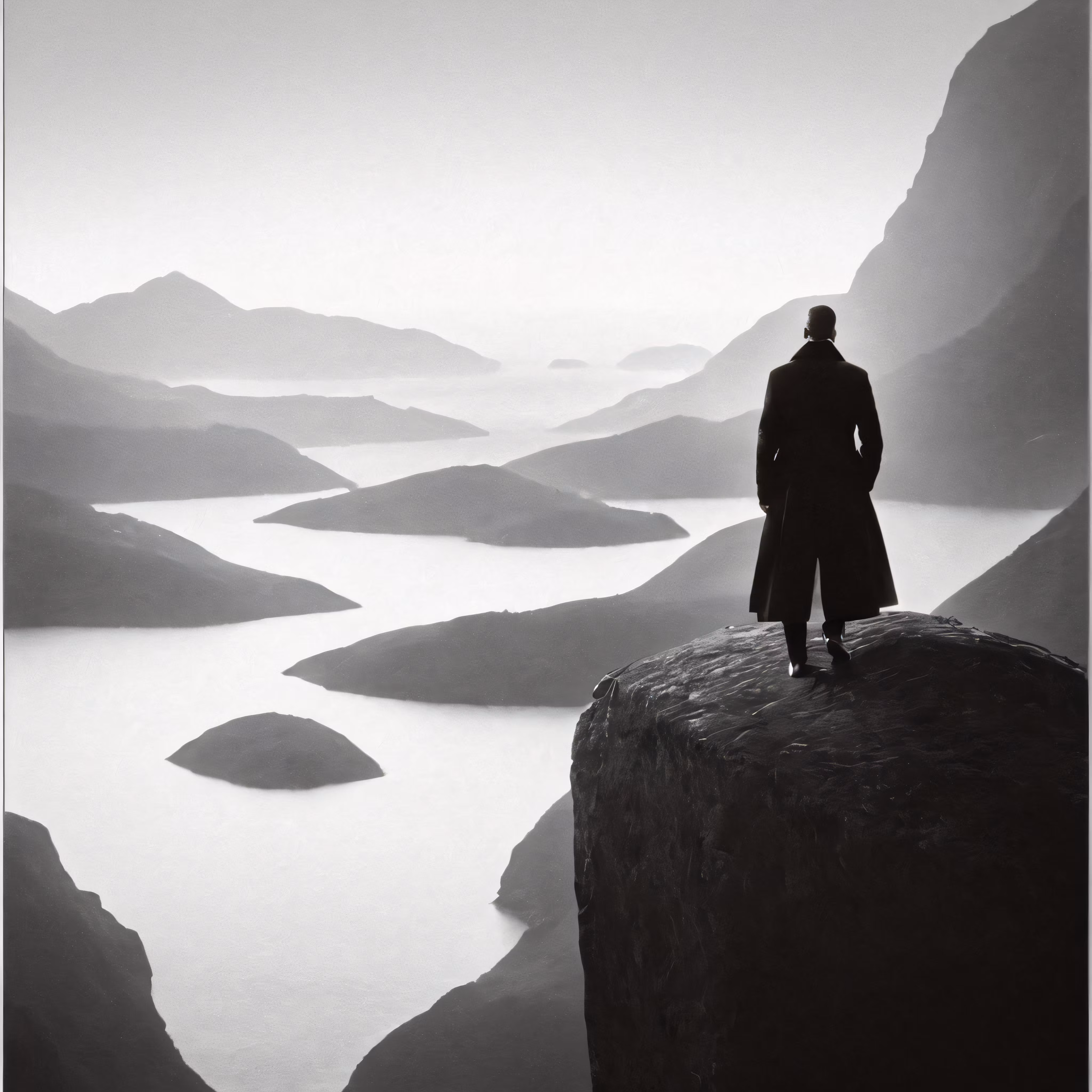 High resolution picture, free to use, black and white photograph of a man standing at the top of a mountain