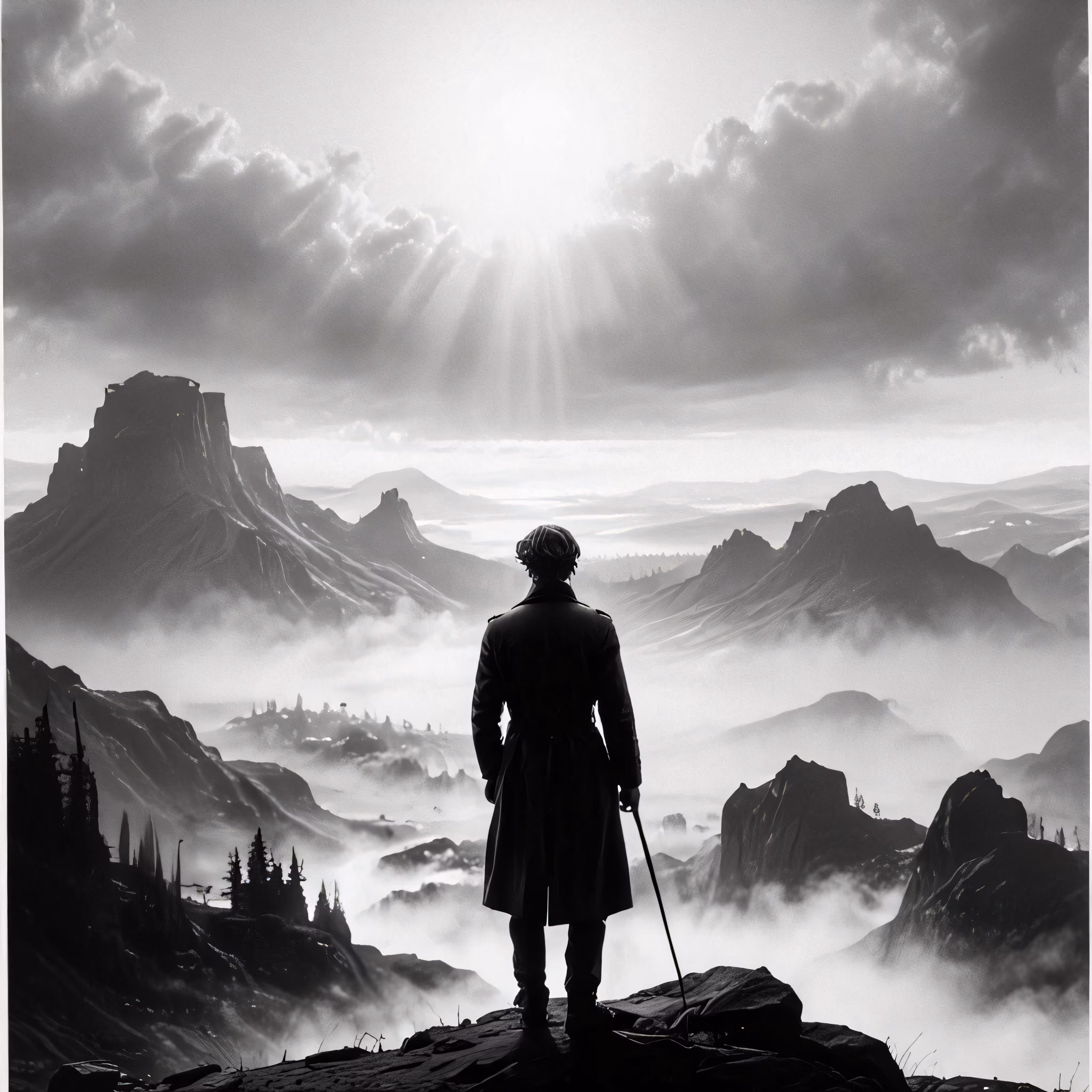High resolution picture, free to use, black and white photograph of a man standing on a hill