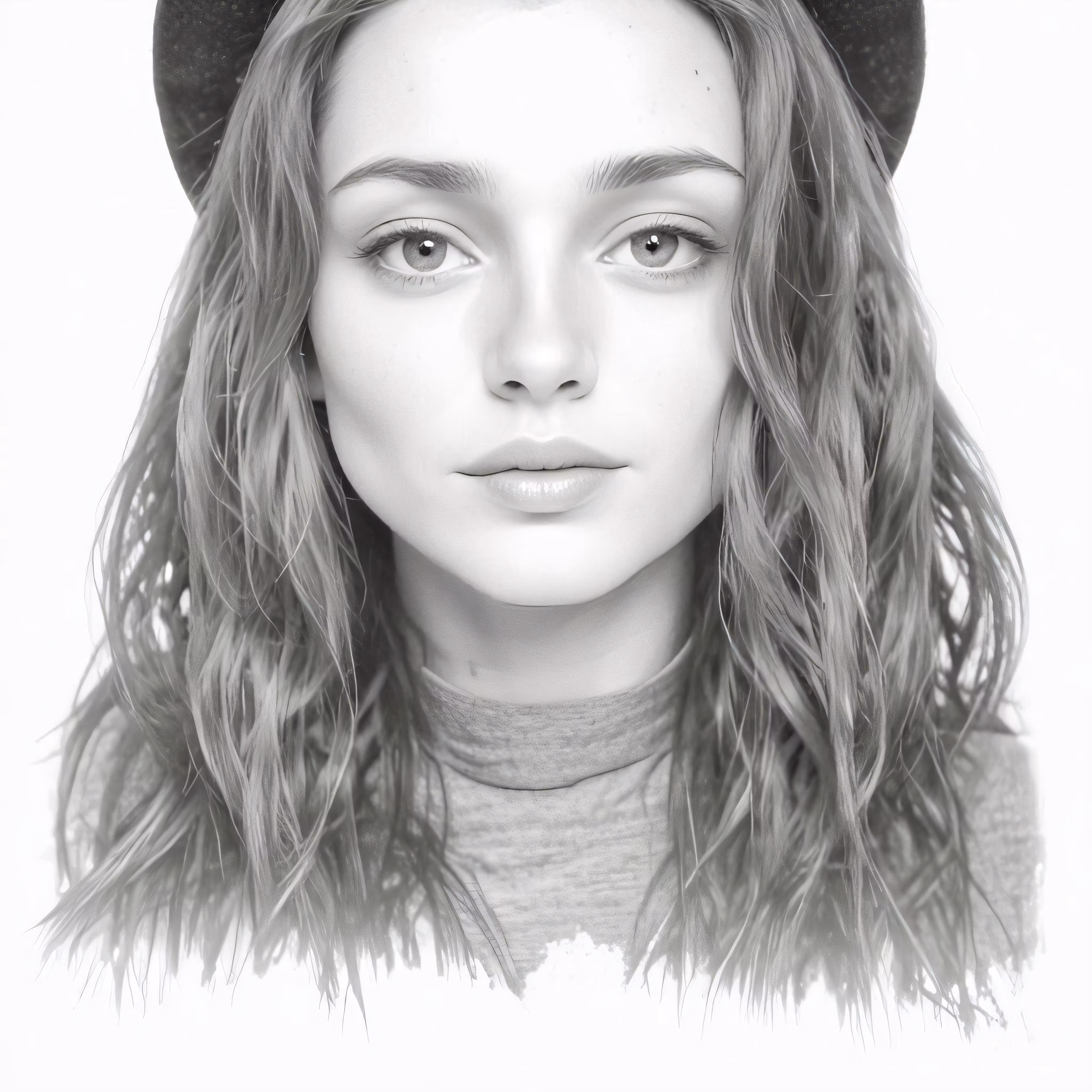 High resolution picture, free to use, black and white photograph of a woman with long hair wearing a hat