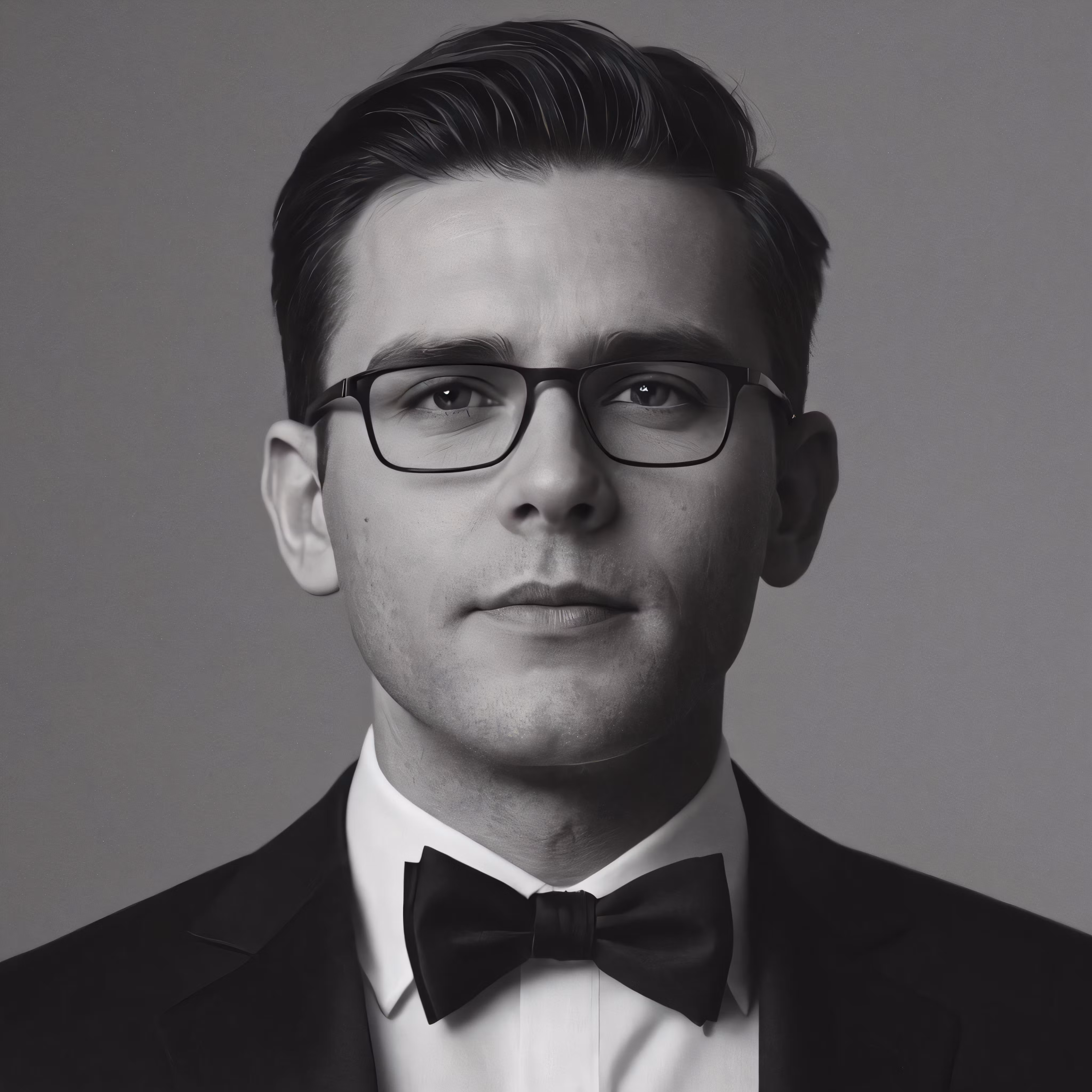 High resolution picture, free to use, black and white photograph of a young man wearing a suit and bow tie