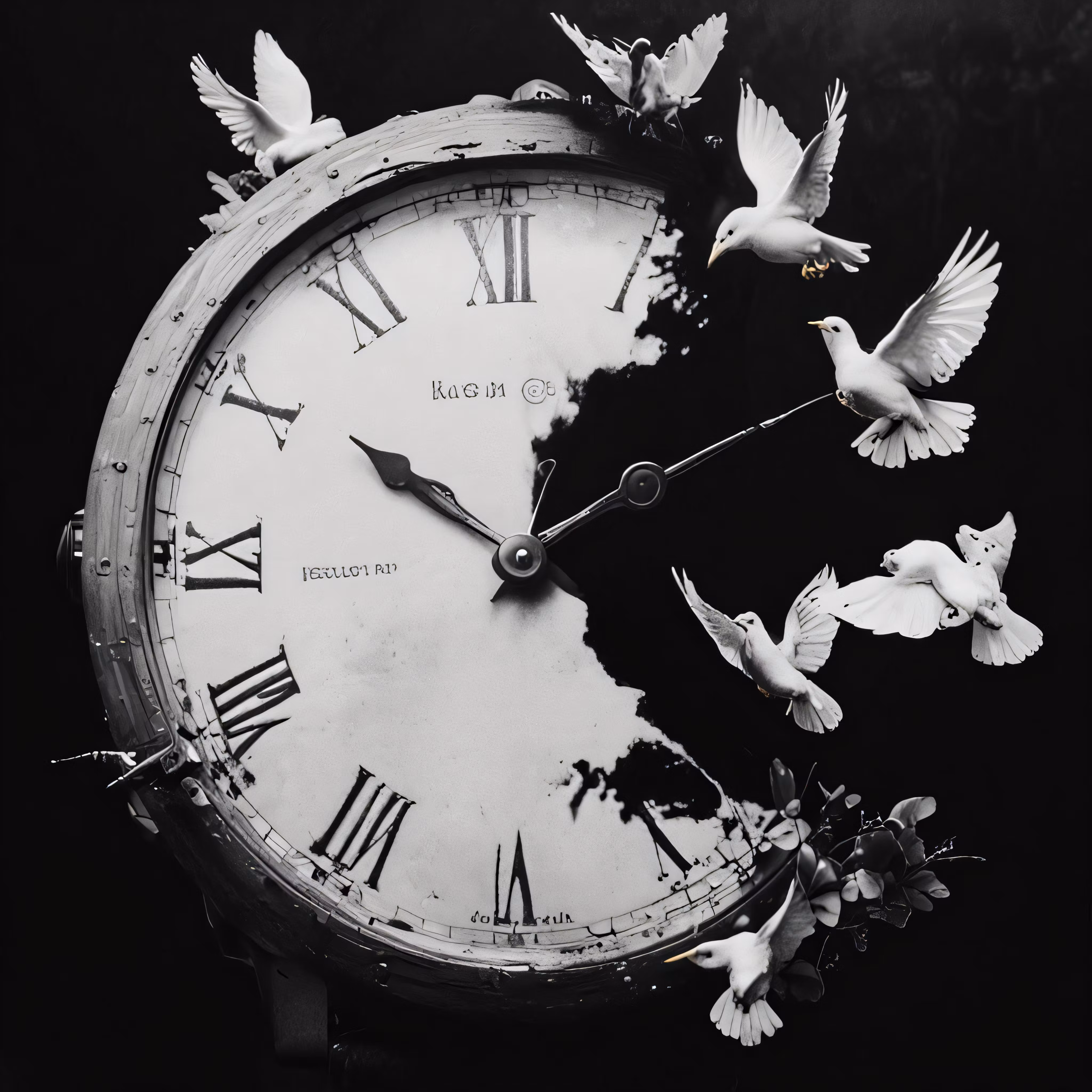 High resolution picture, free to use, black and white photograph of birds flying near a clock