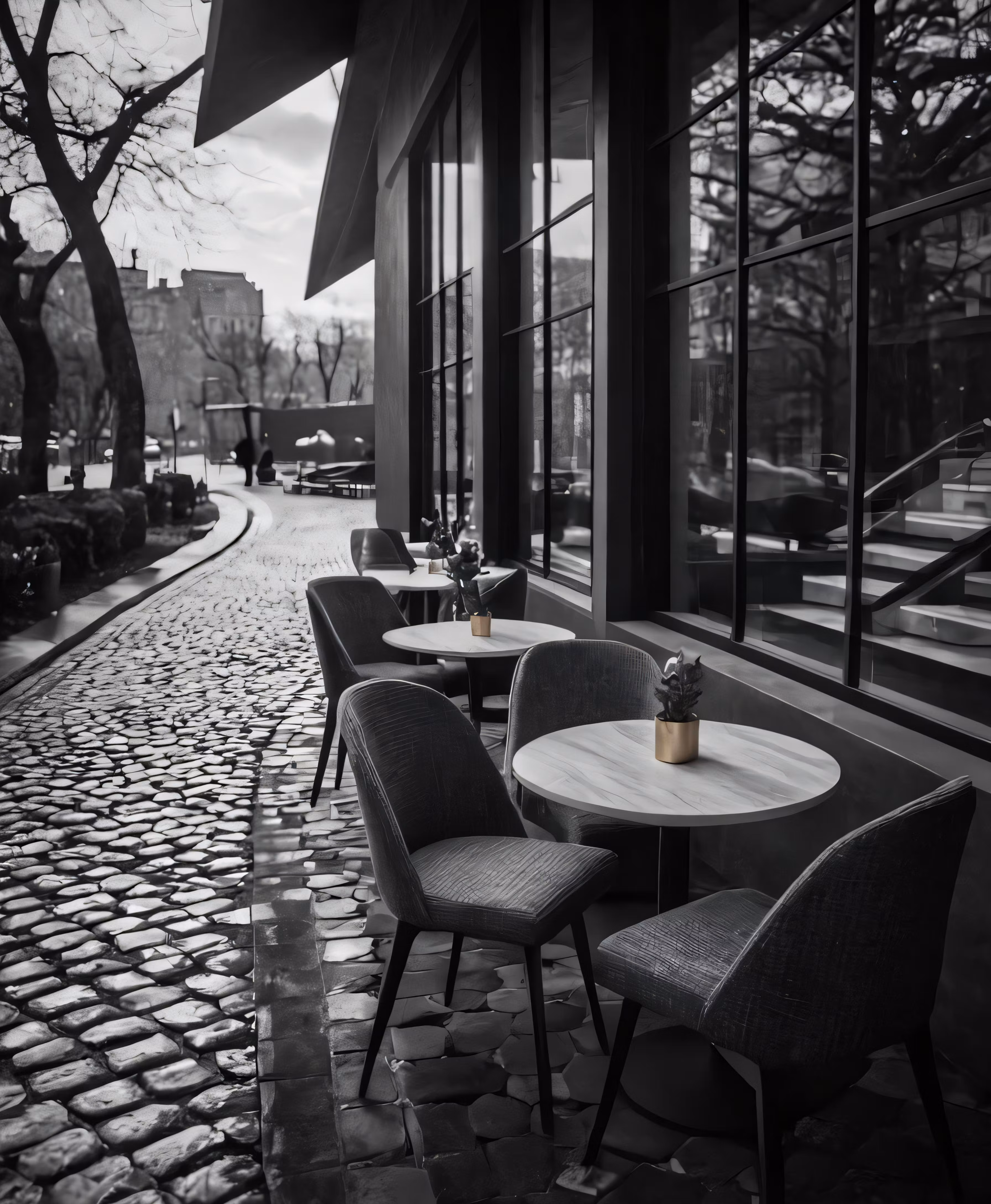 High resolution picture, free to use, black and white photograph of tables, chairs and the street