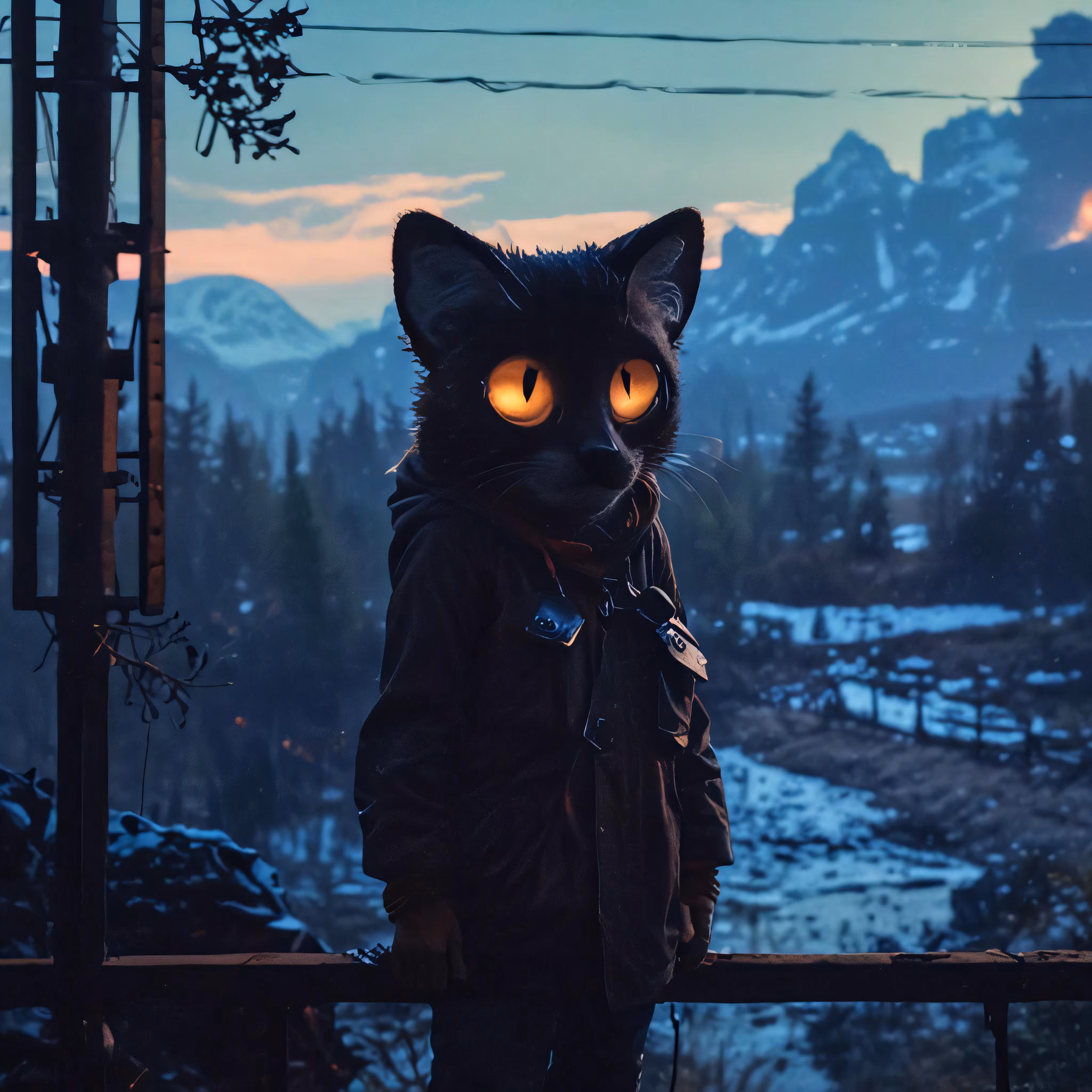 High resolution picture, free to use, black cat with glowing eyes standing outside in winter time
