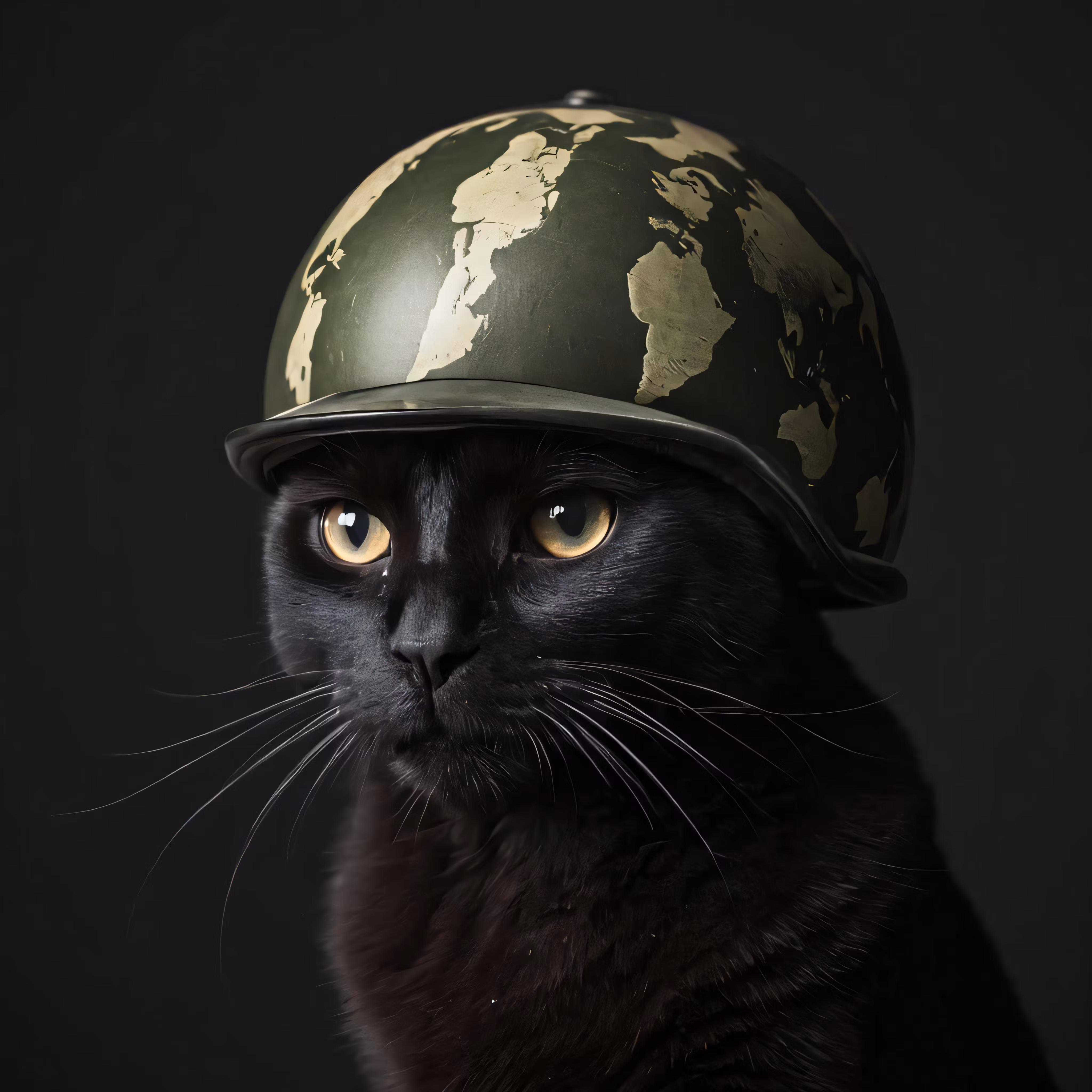 High resolution picture, free to use, black cat with military style helmet staring directly at camera