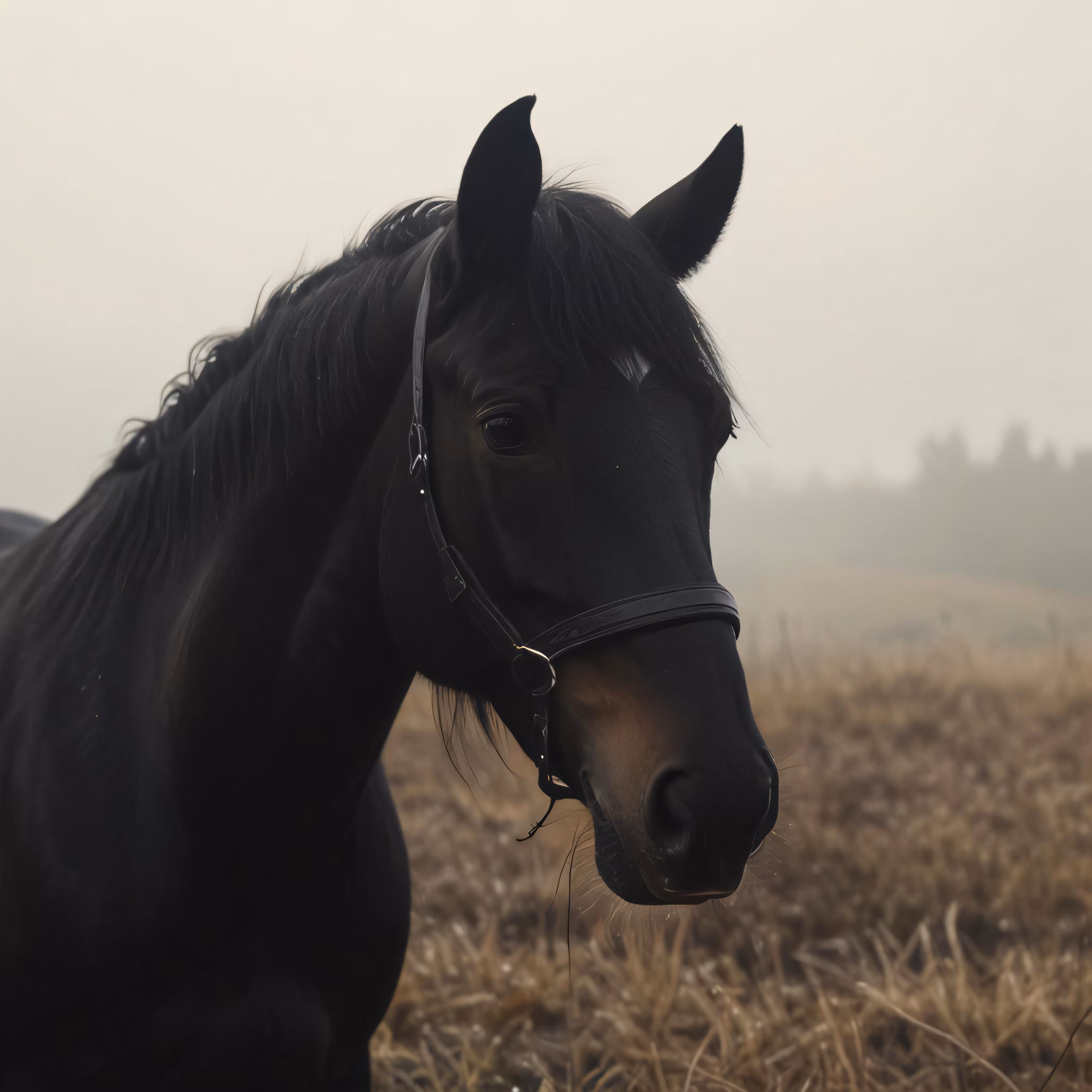 High resolution picture, free to use, black horse standing in an open field on a foggy day