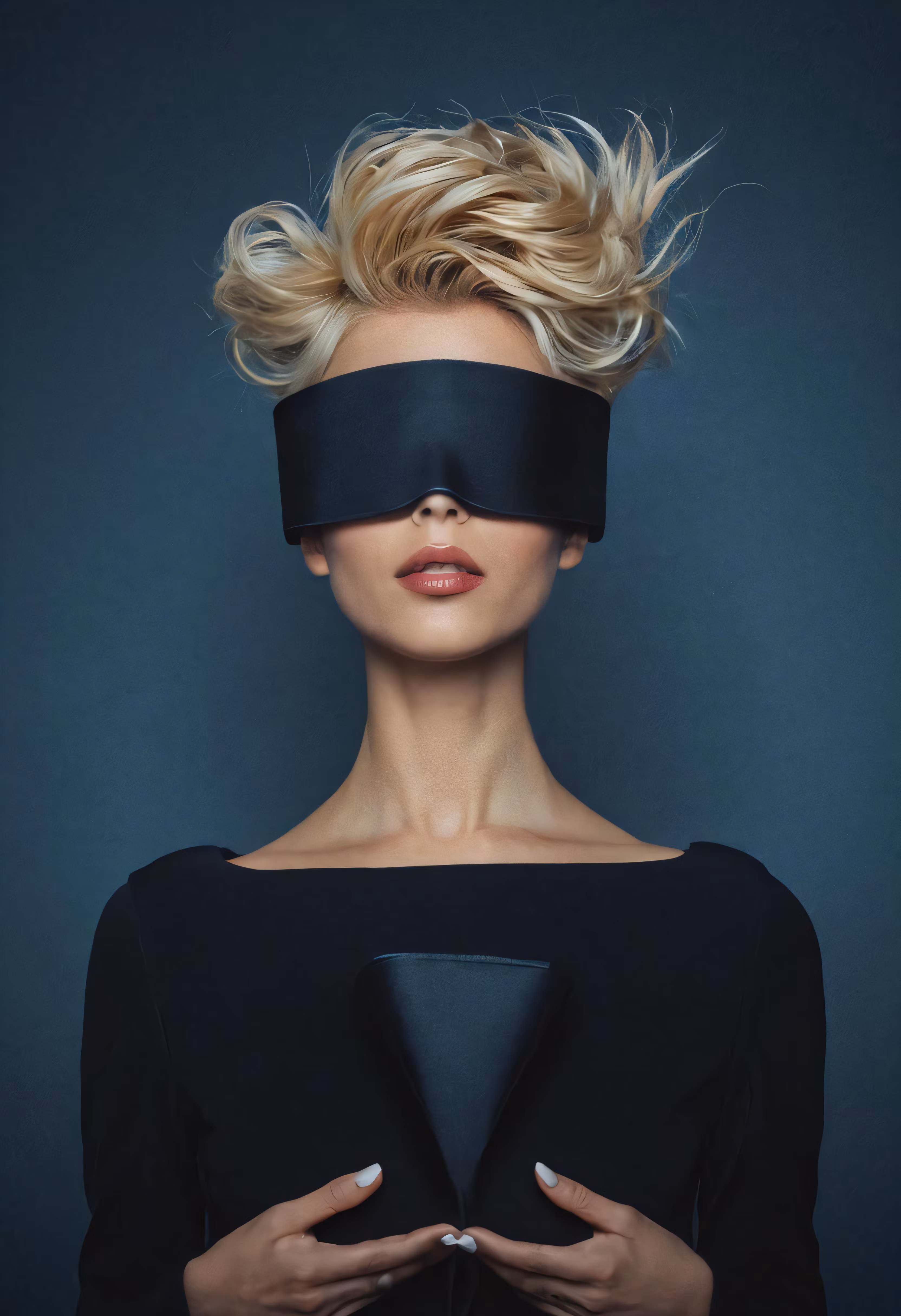 High resolution picture, free to use, blonde woman wearing blindfold over her eyes looking down
