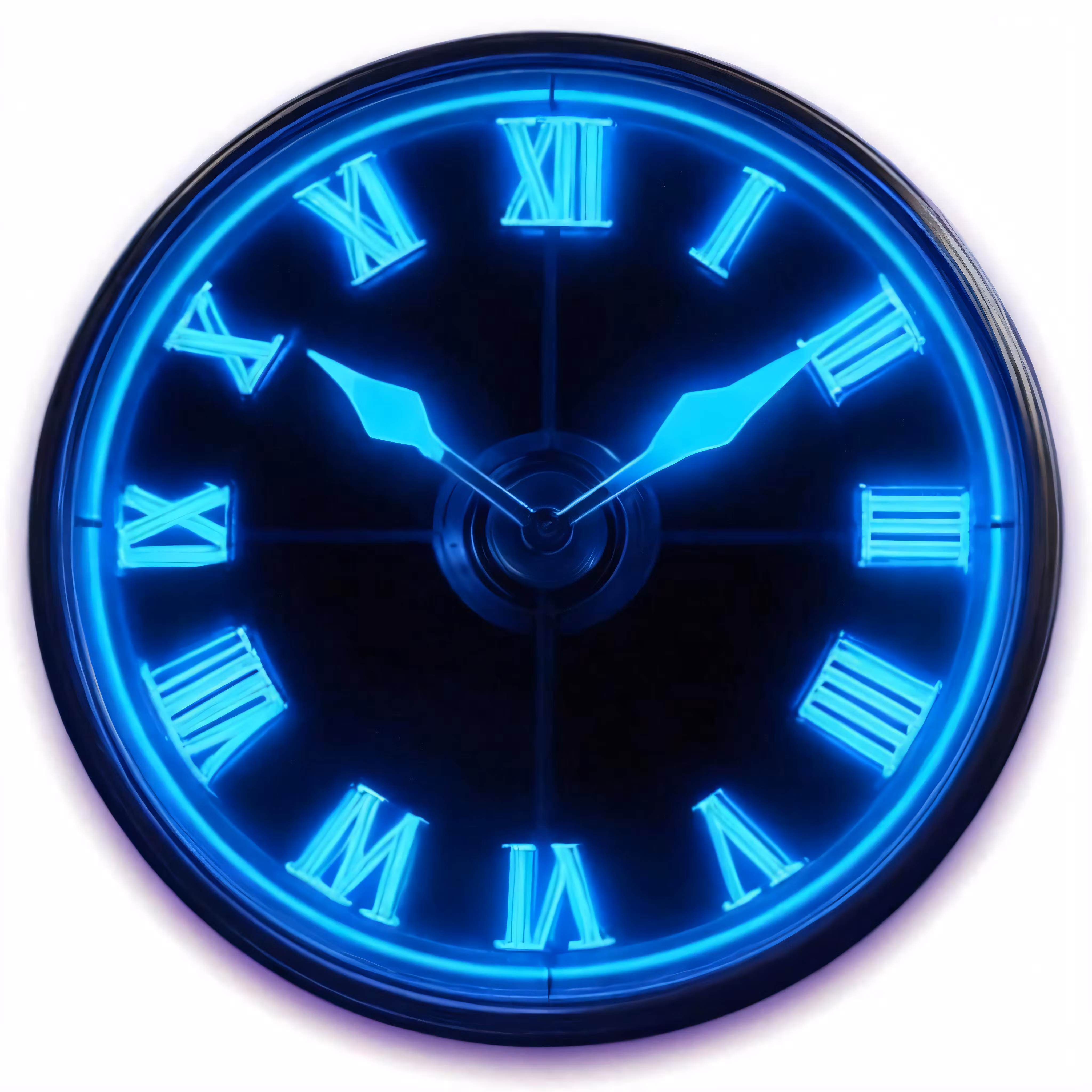 High resolution picture, free to use, blue glow clock with roman numerals glowing brightly