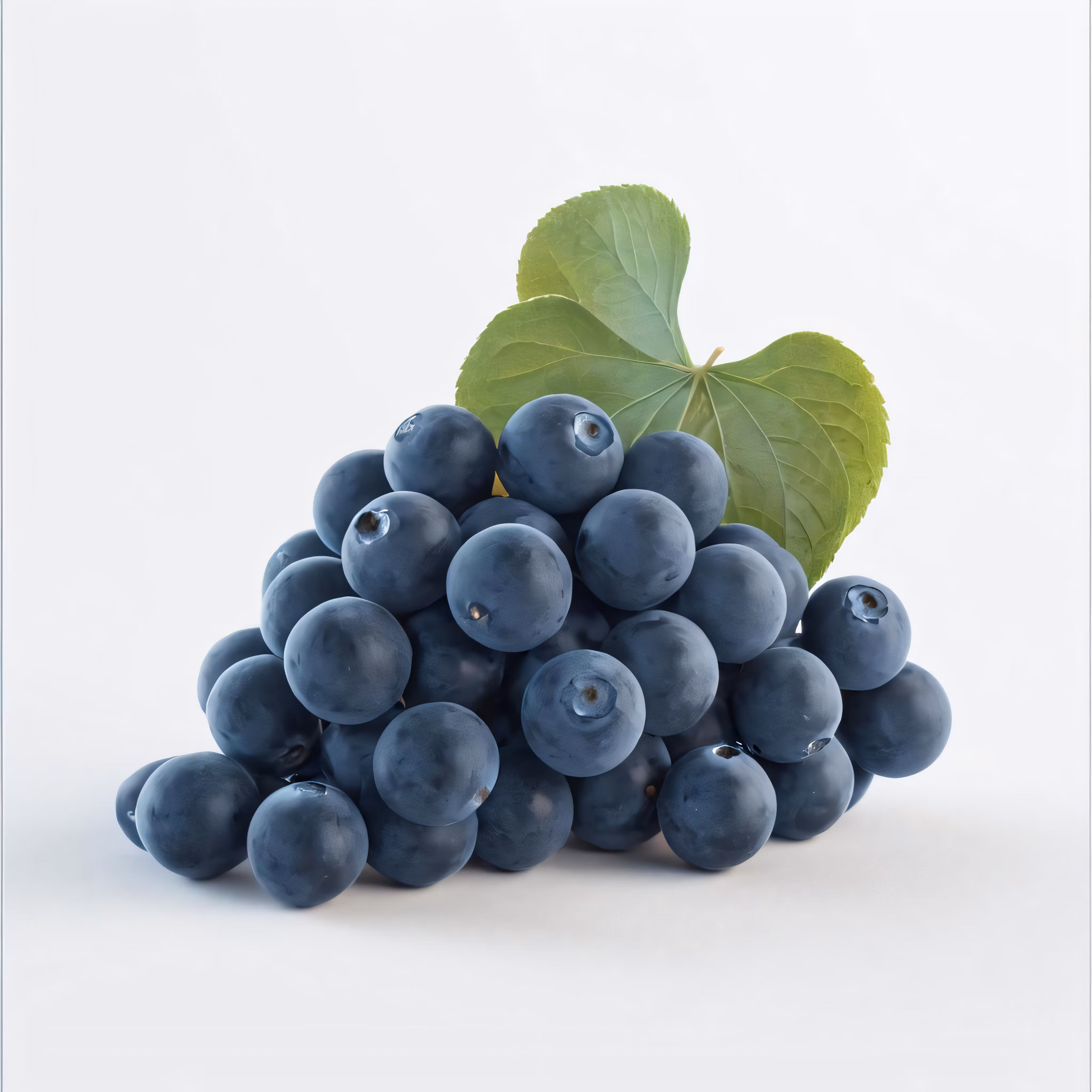 High resolution picture, free to use, blue grapes with green leaves displayed in front of a white background
