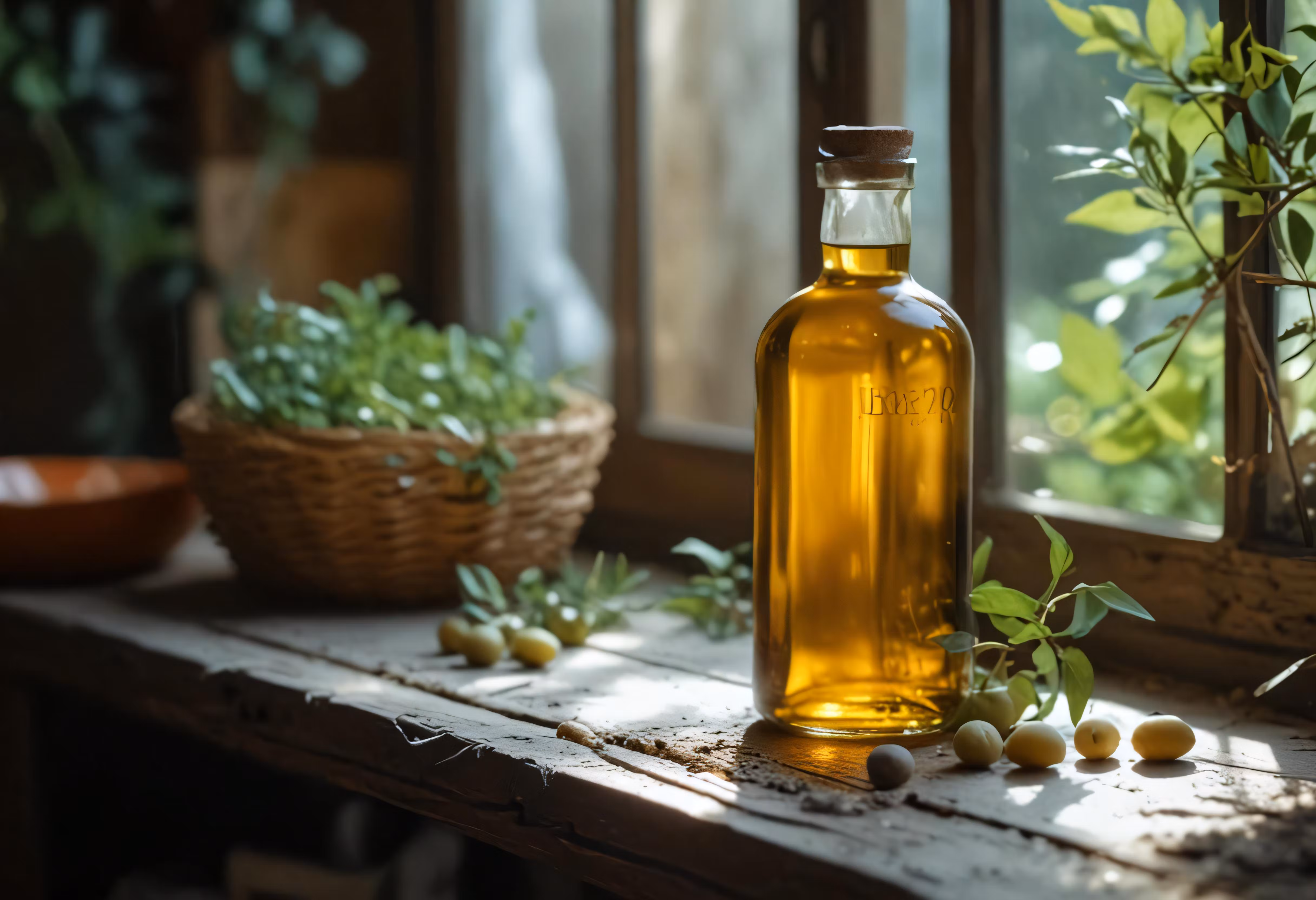 High resolution picture, free to use, bottle of oil on a window sill with basil