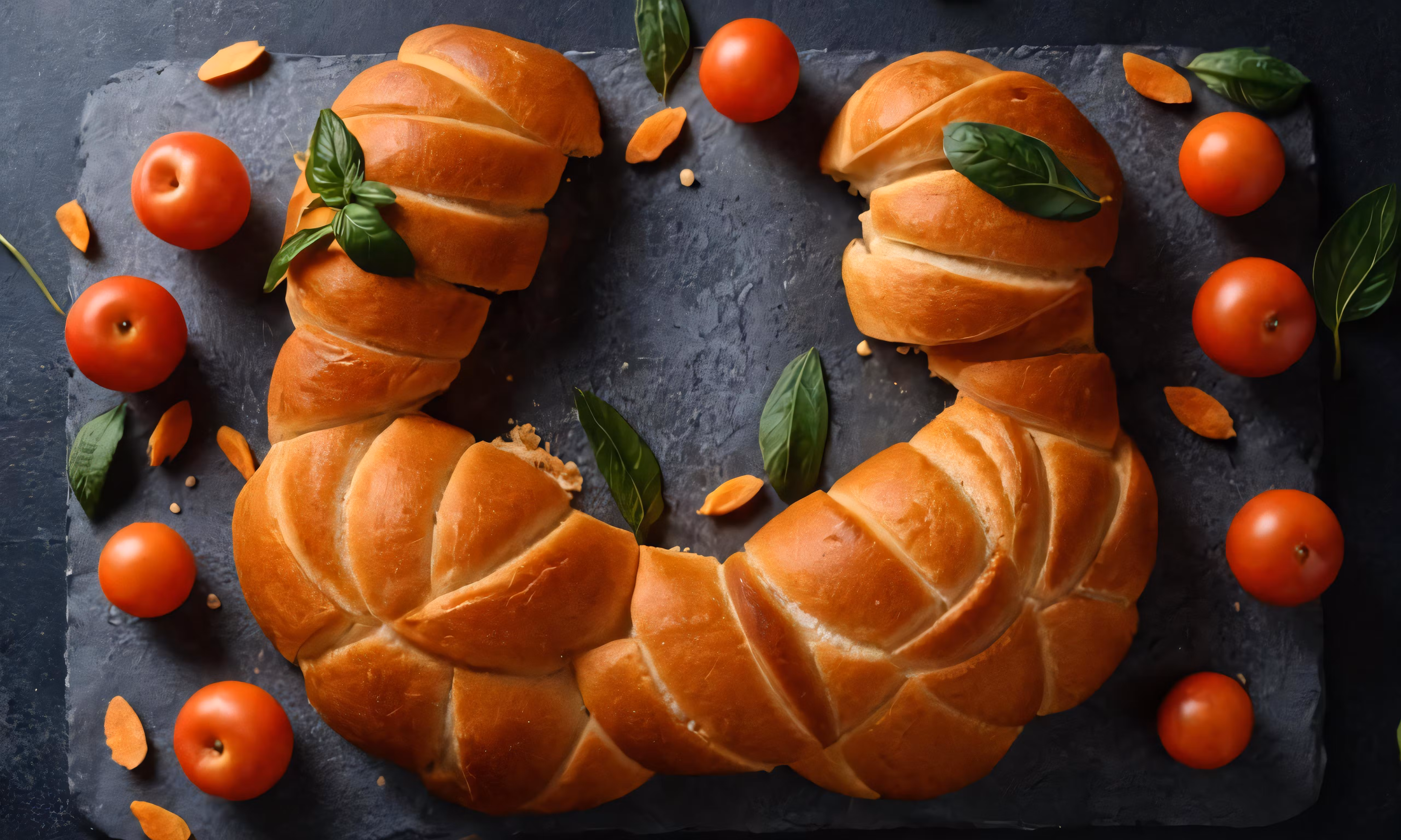 High resolution picture, free to use, bread in the shape of a face made out of strips of croissants and orange slices, with tomatoes, greens and leaves surrounding it