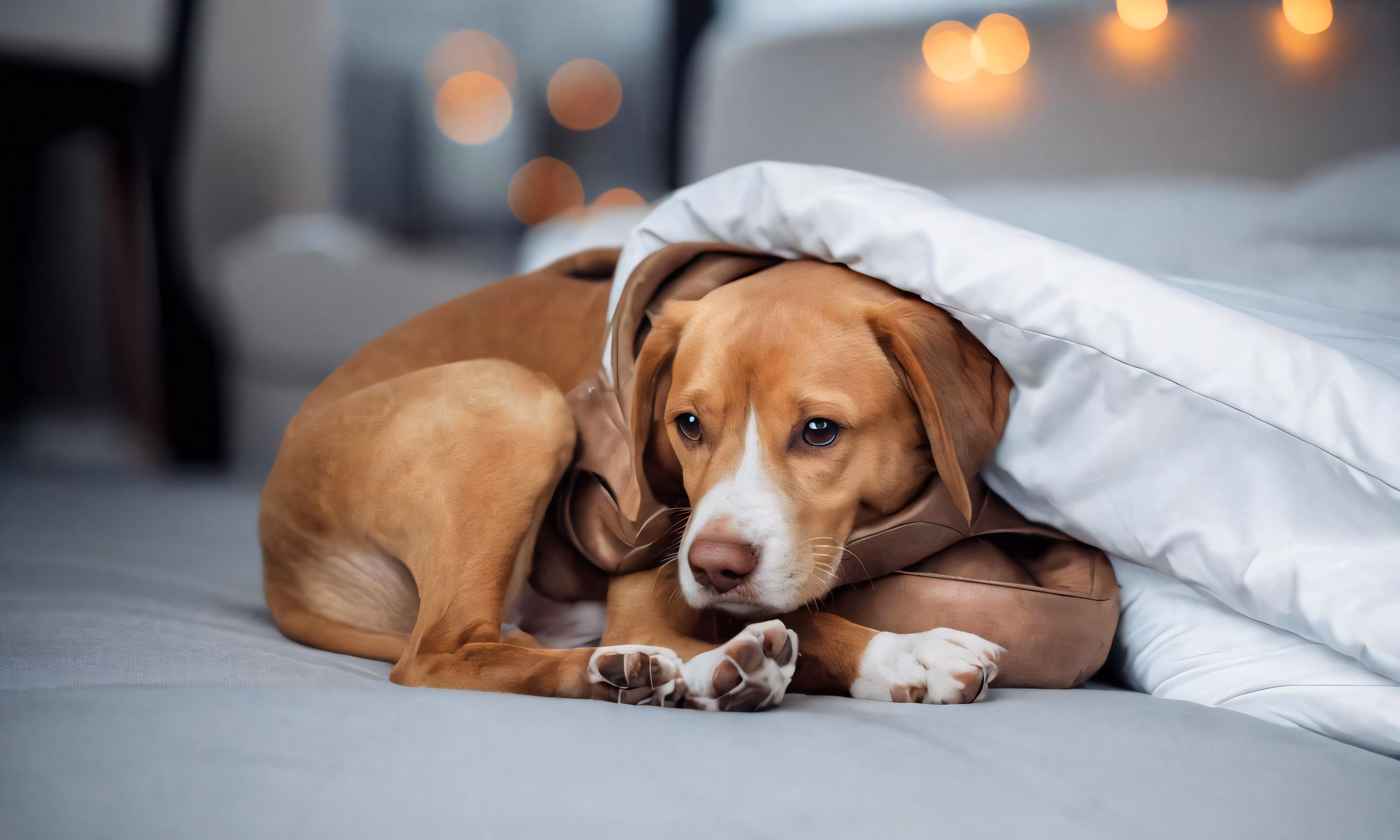 High resolution picture, free to use, brown dog laying under the blanket in bed