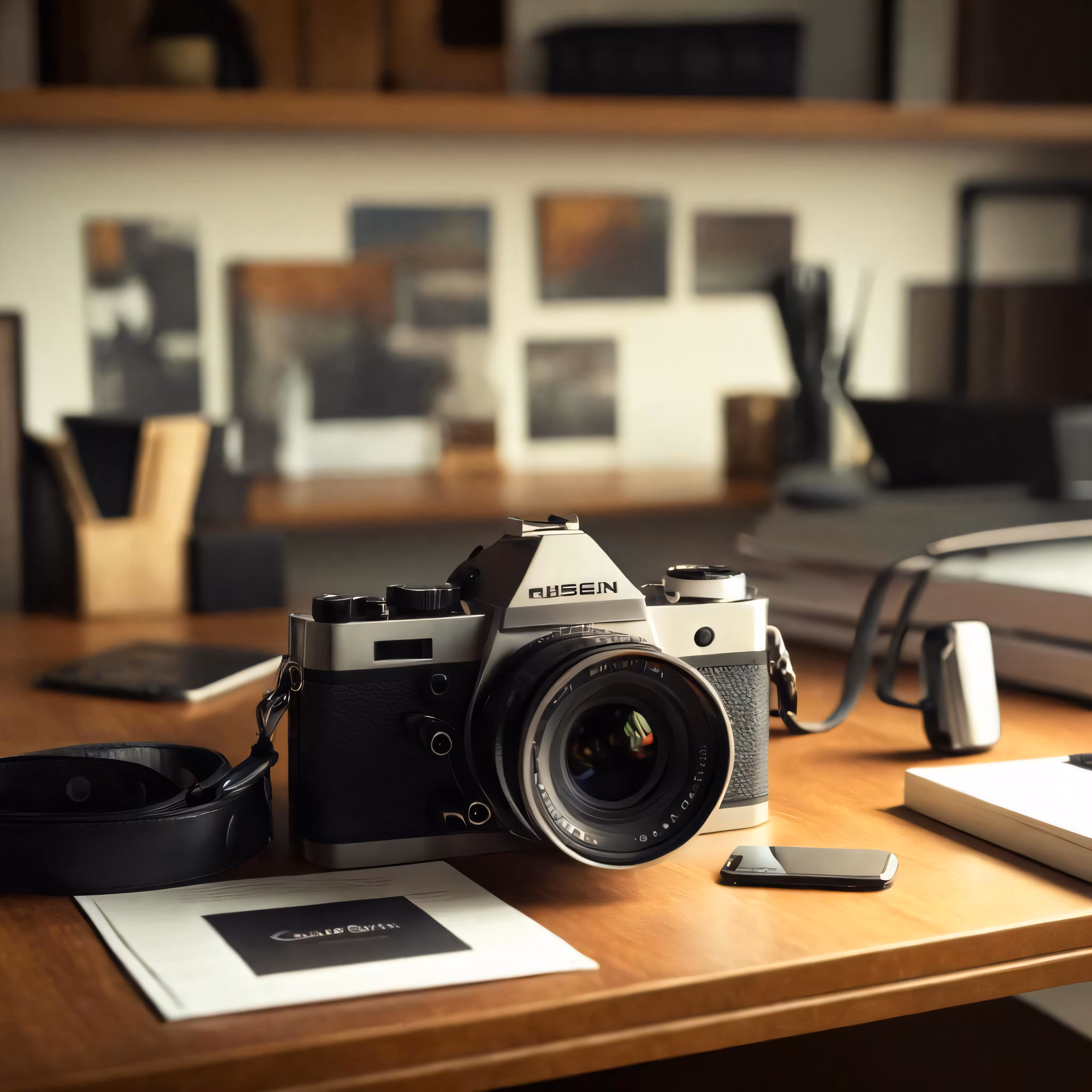 High resolution picture, free to use, camera sitting on a desk with books and a laptop nearby