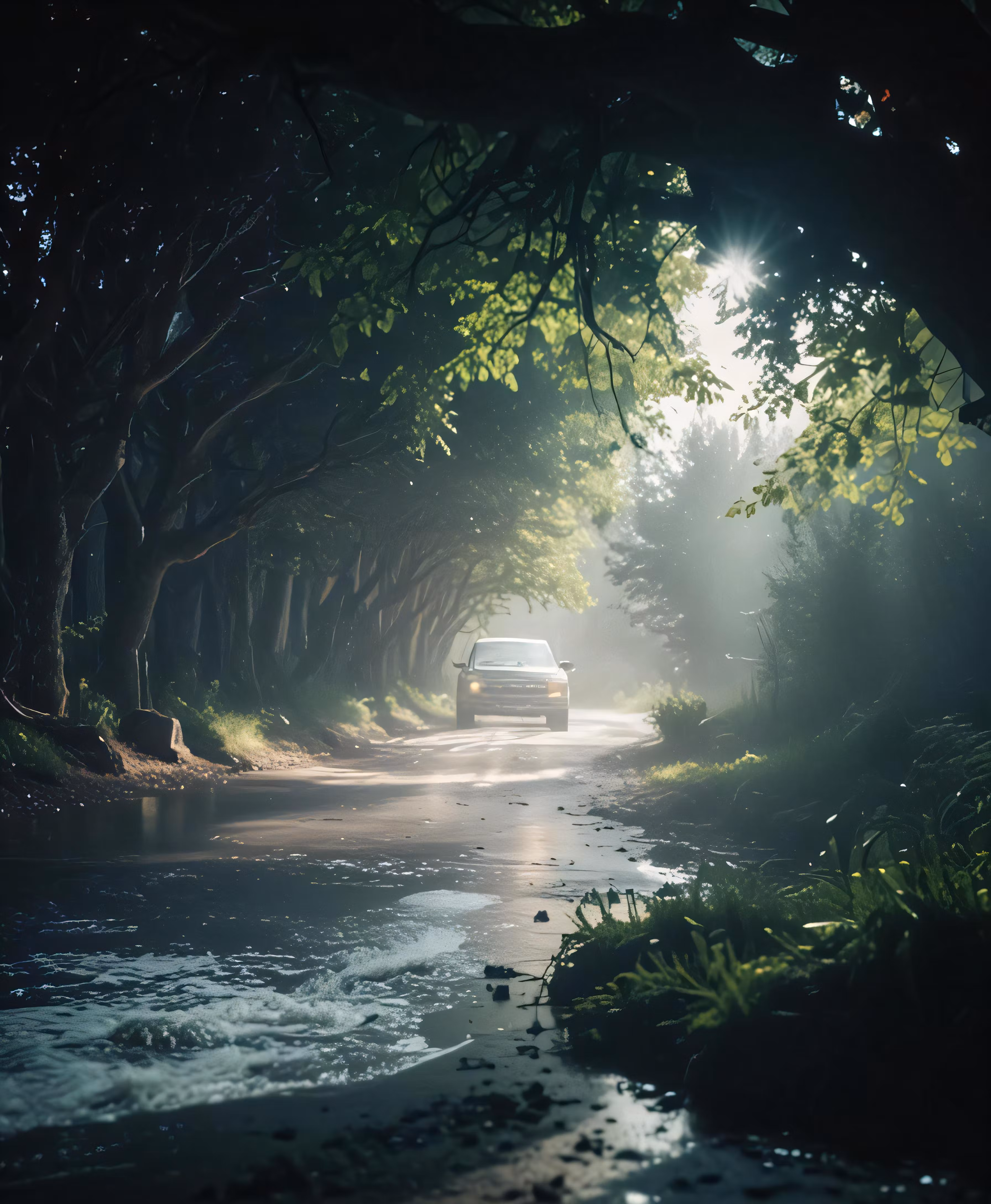 High resolution picture, free to use, car driving down road next to trees during daytime