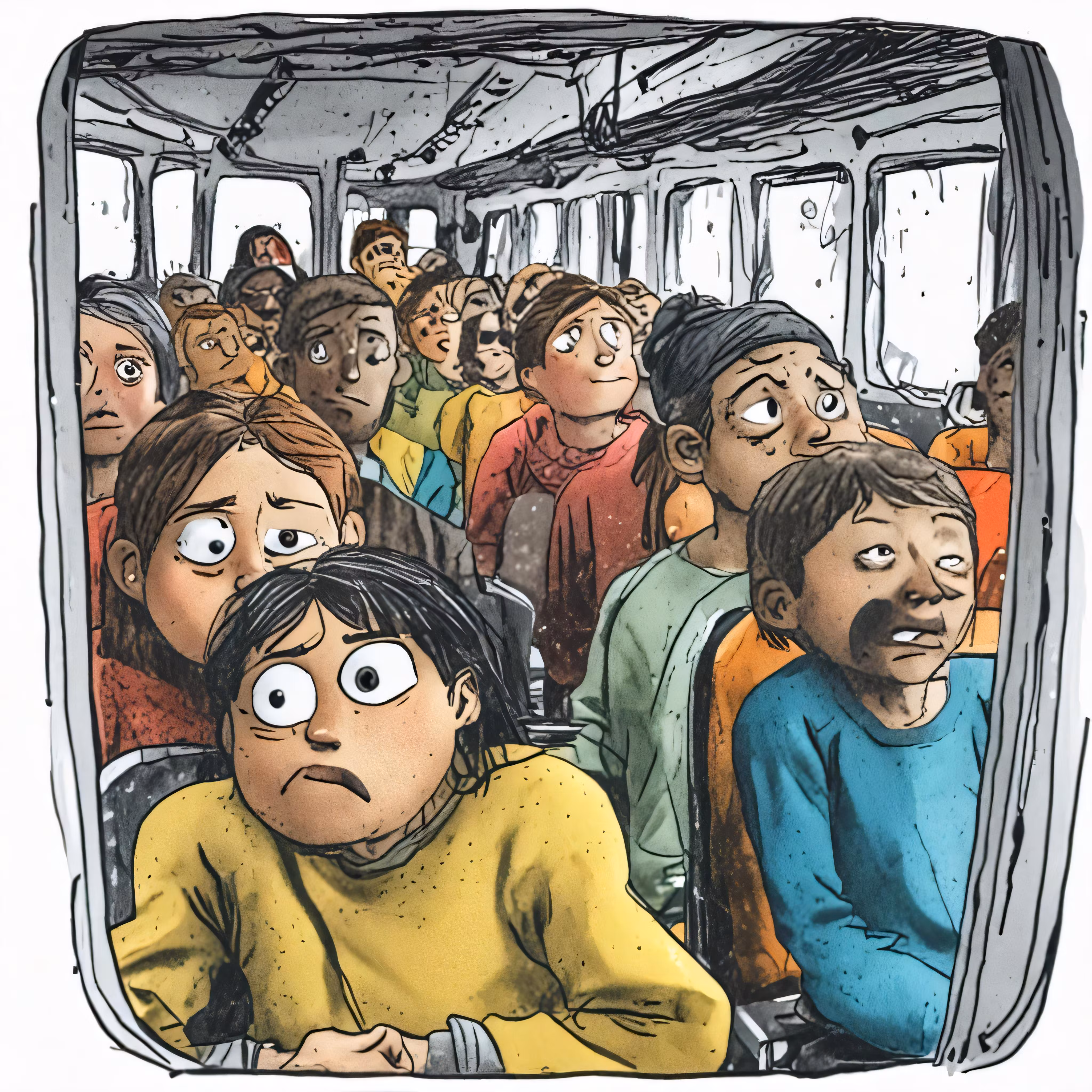 High resolution picture, free to use, cartoon character with a crowd of people looking