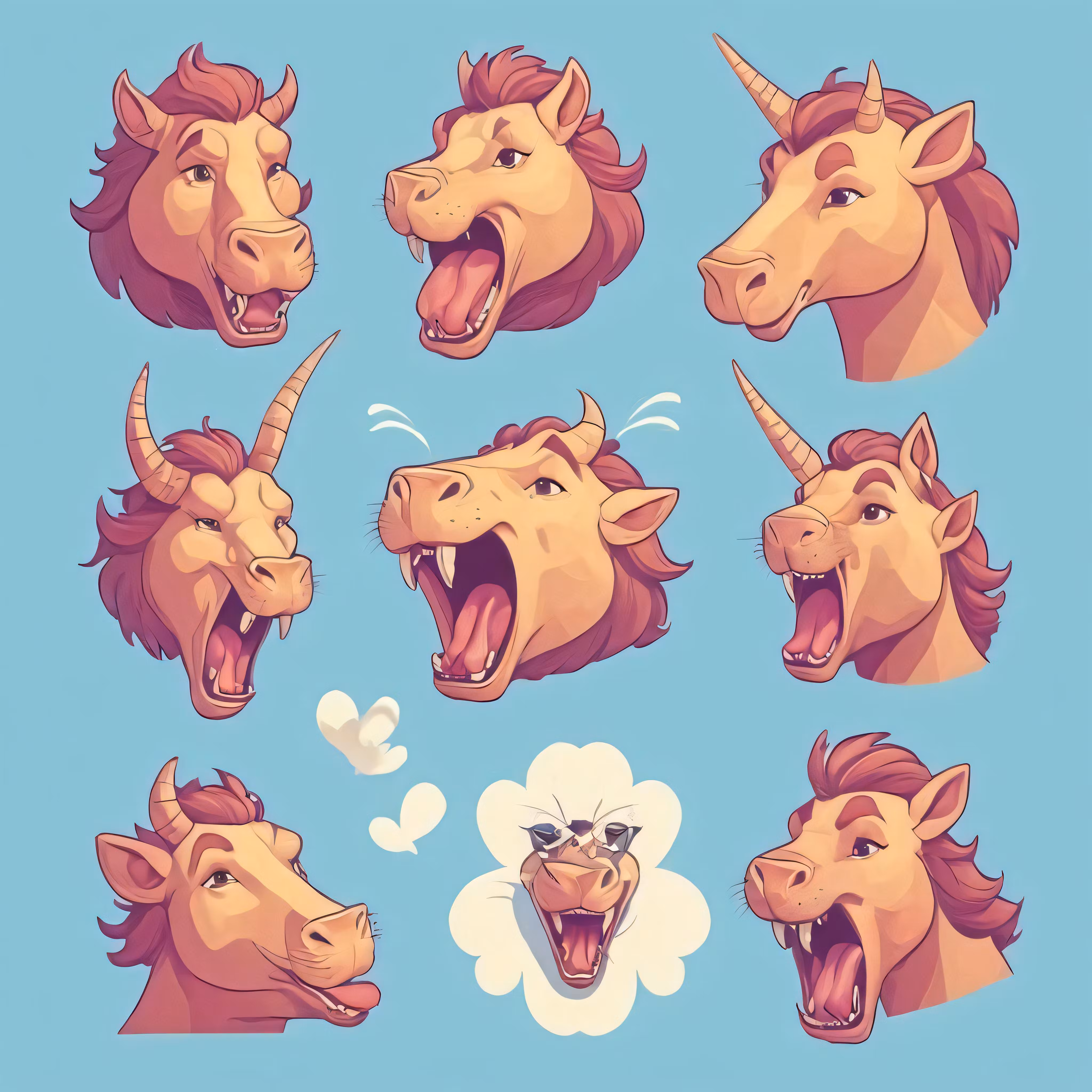 High resolution picture, free to use, cartoon design of horned animals showing different facial expressions