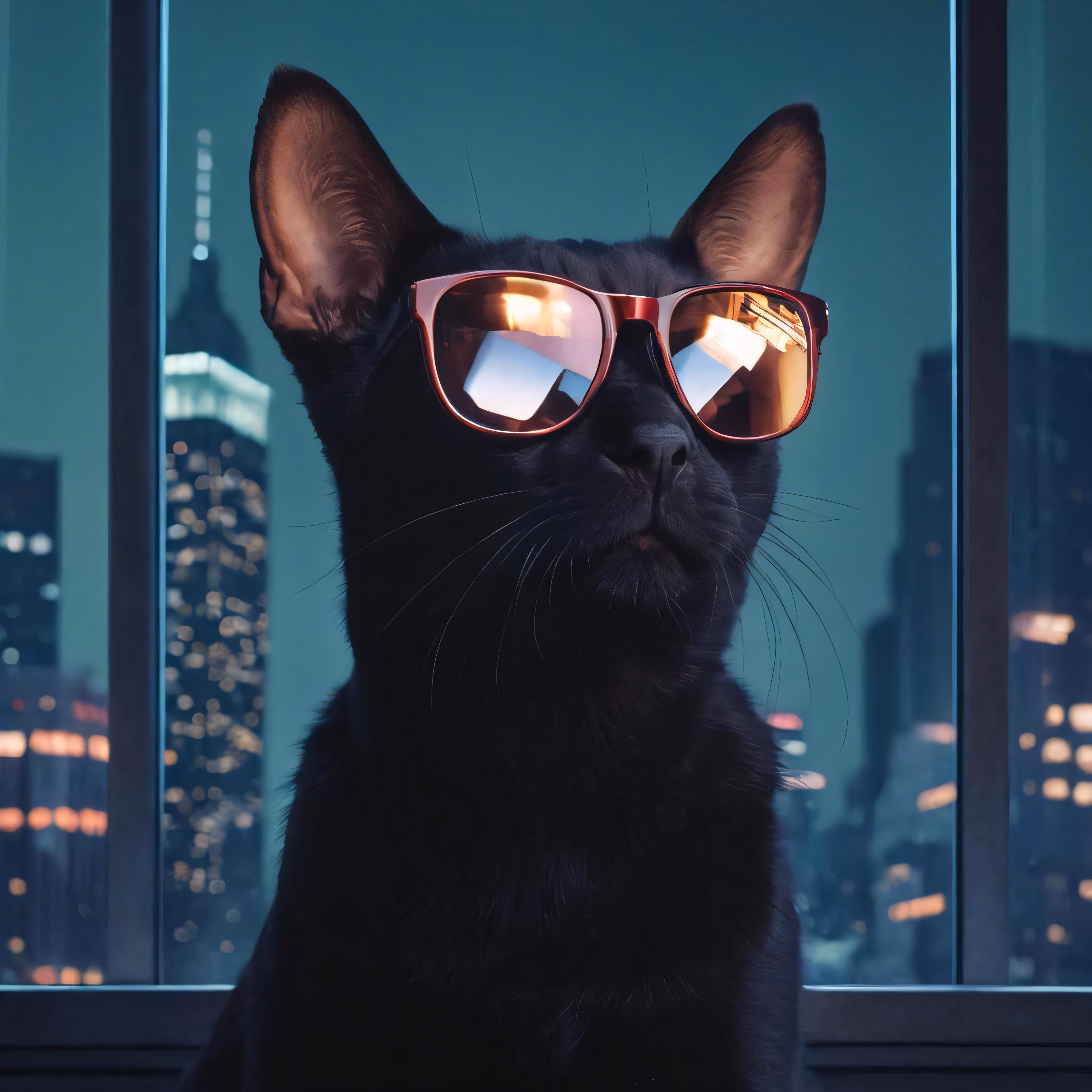 High resolution picture, free to use, cat in sunglasses staring at the city at night