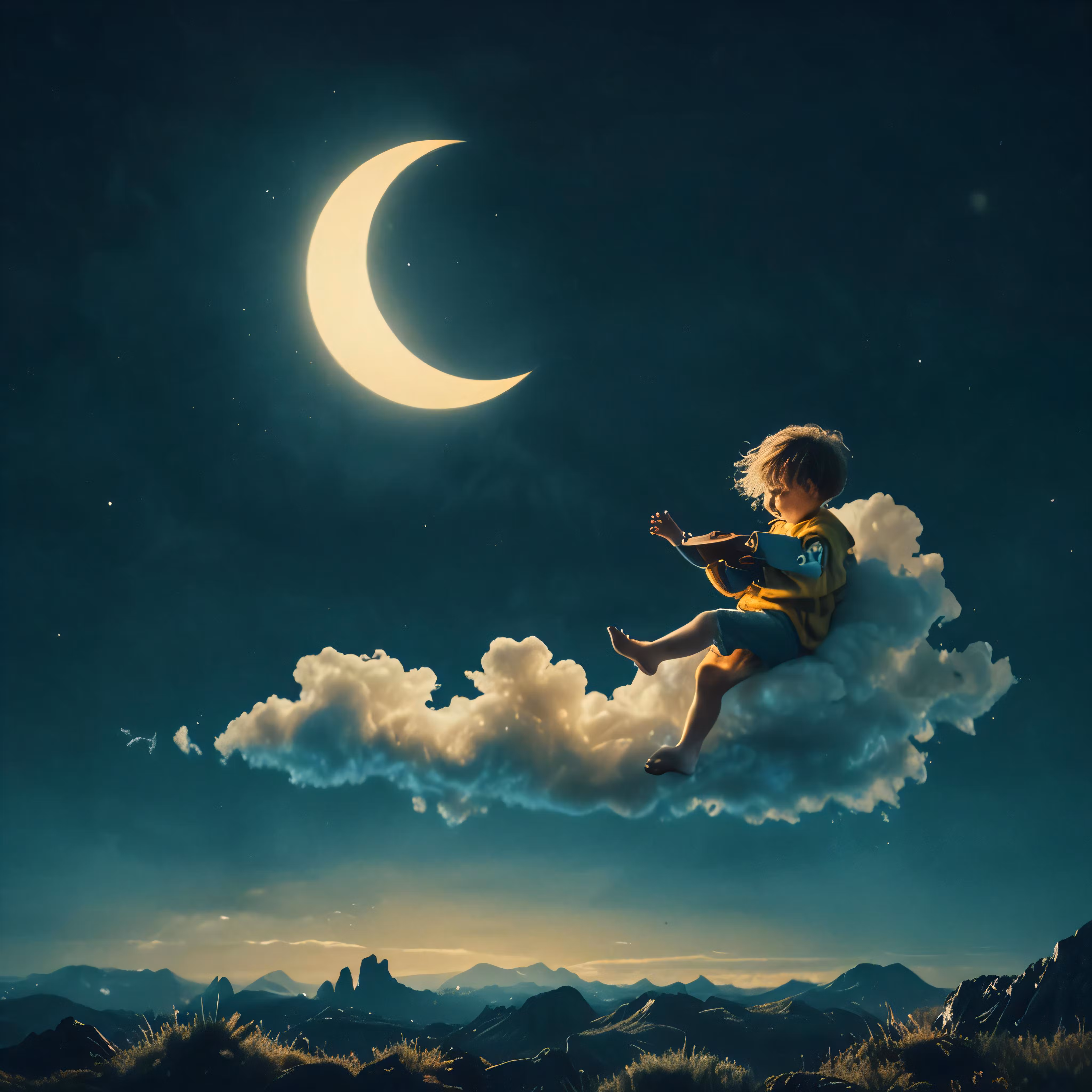 High resolution picture, free to use, child sitting on cloud playing guitar under the moon