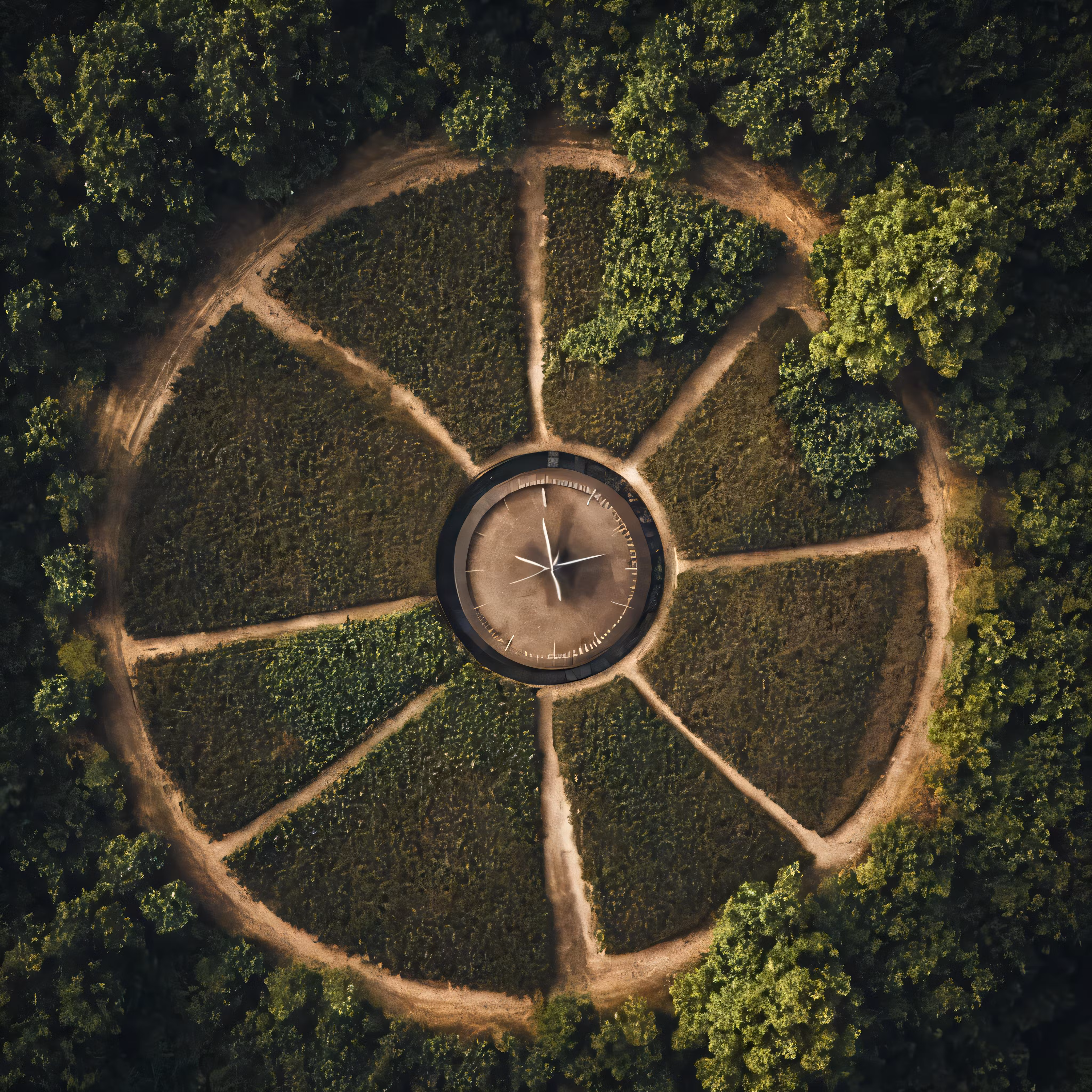 High resolution picture, free to use, circular clock sitting in middle of trees in a field