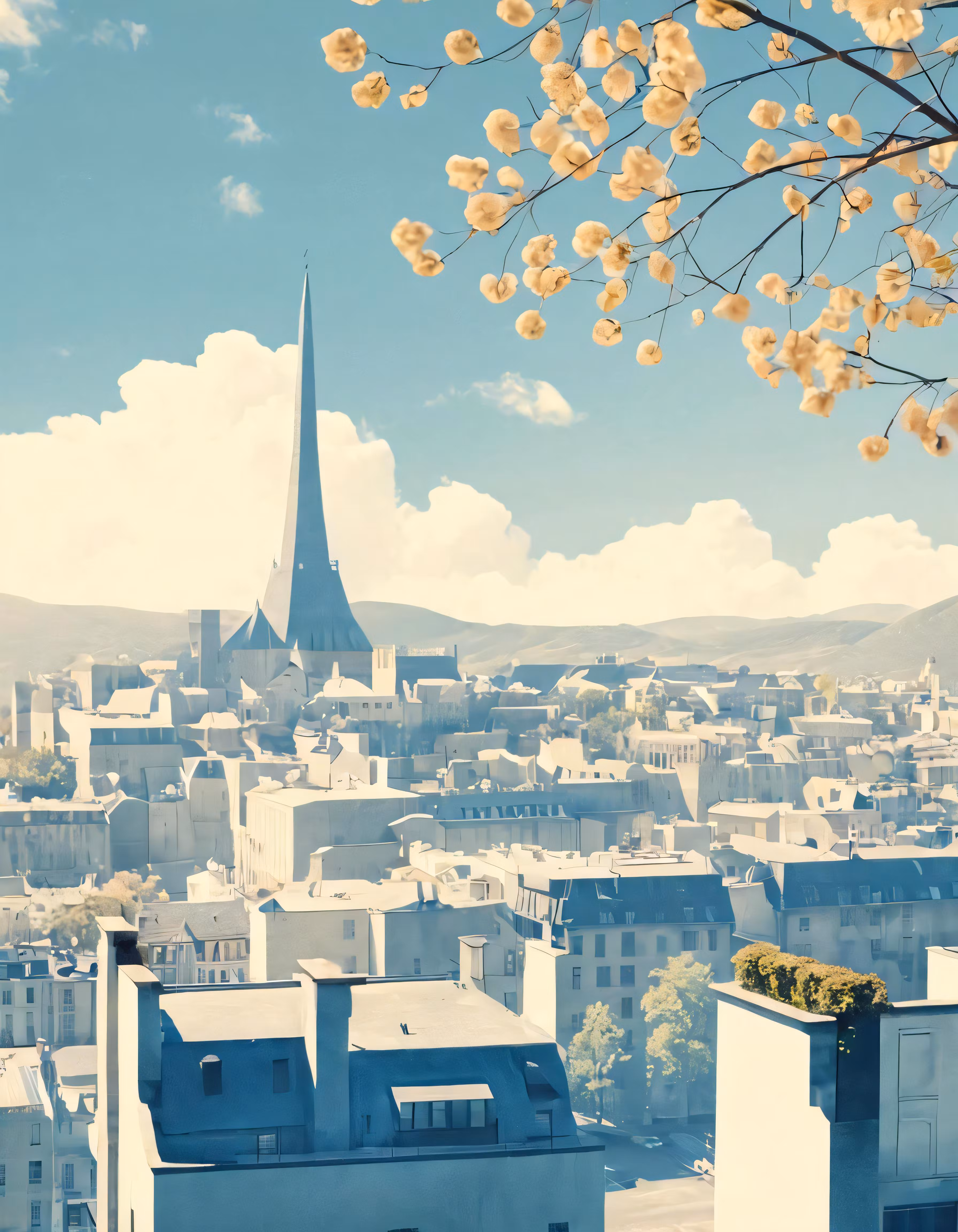 High resolution picture, free to use, city skyline, with buildings, tree blossoms, and spire in distance