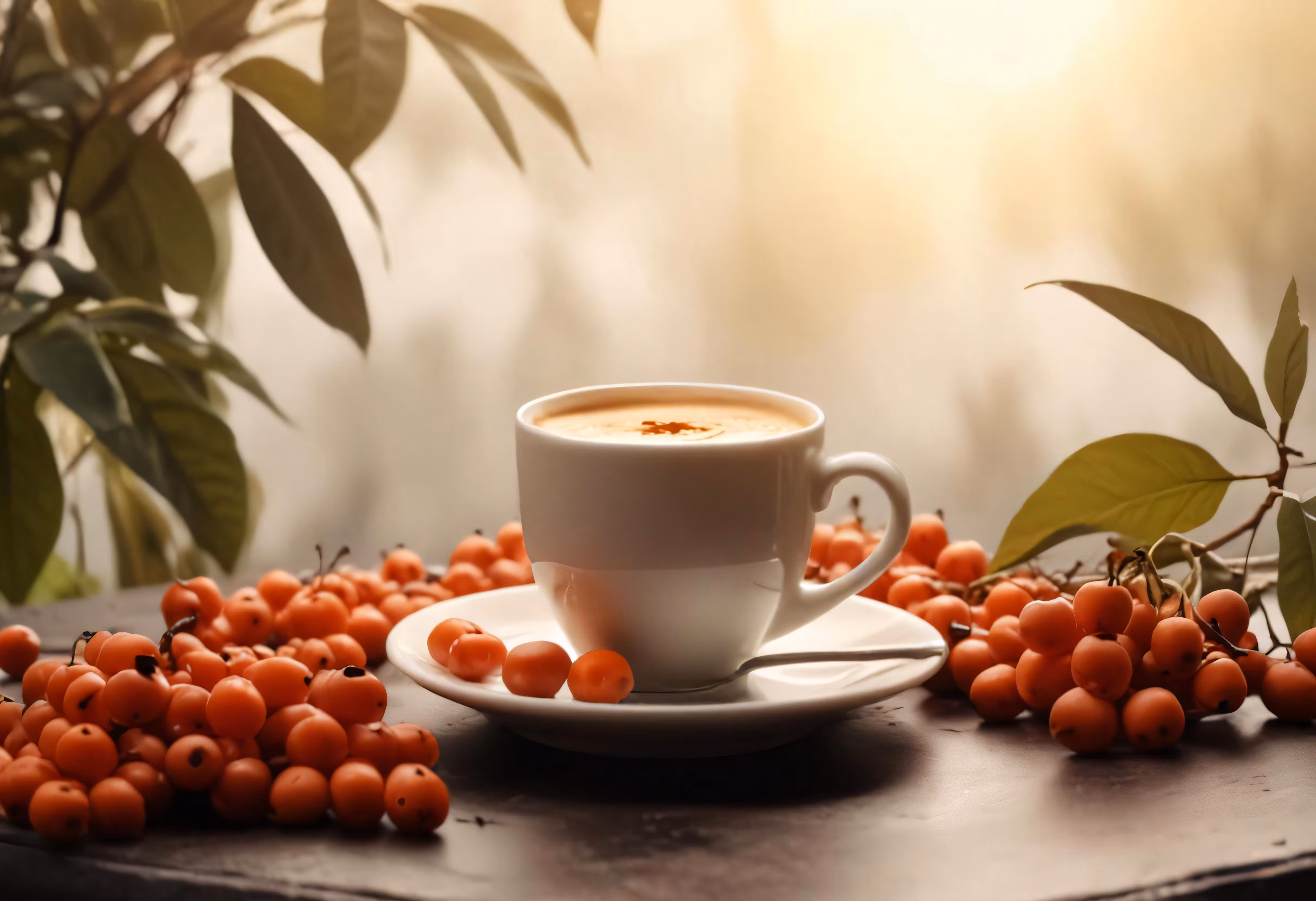 High resolution picture, free to use, coffee cup surrounded by orange berries in the morning
