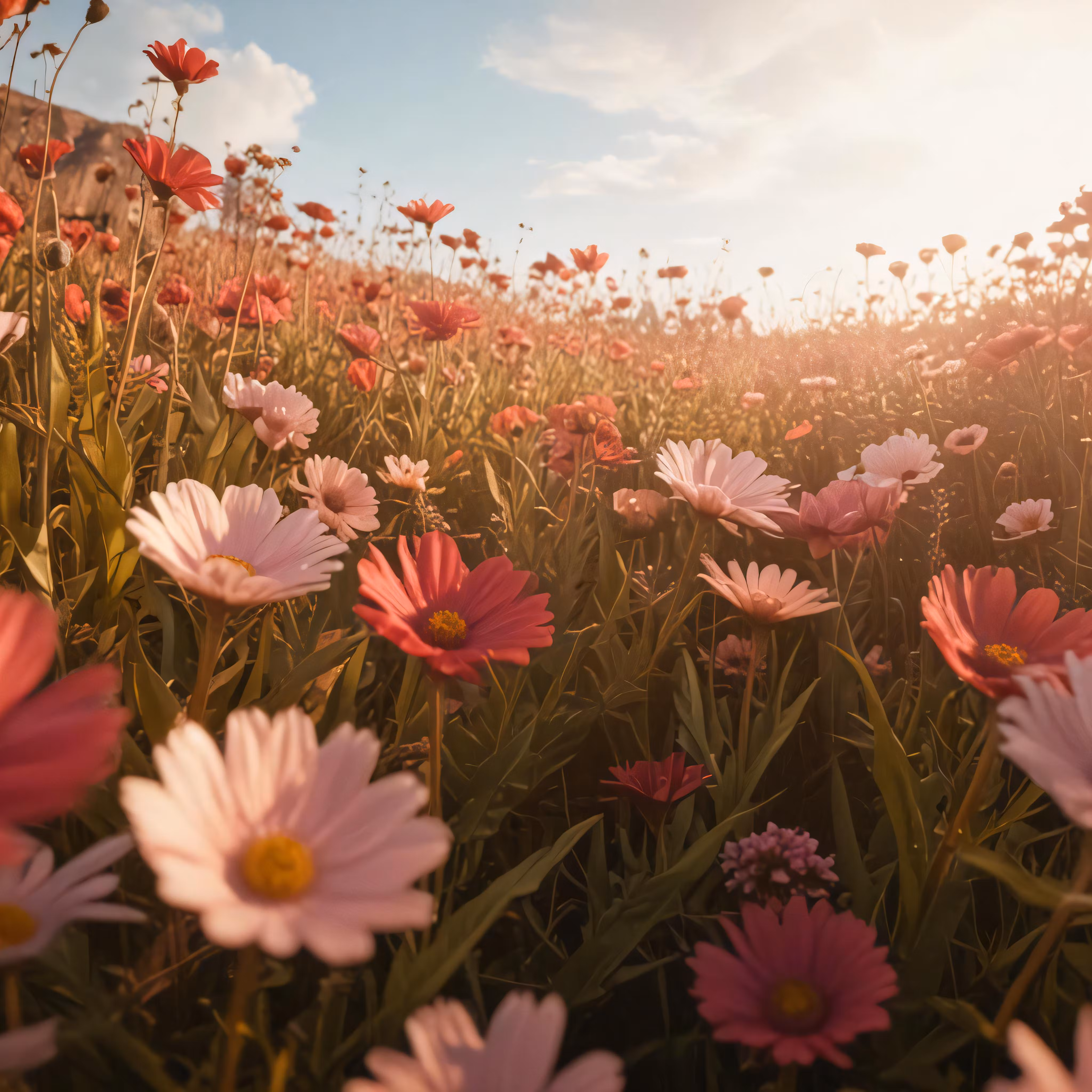 High resolution picture, free to use, colorful flowers grow in the field near a hill