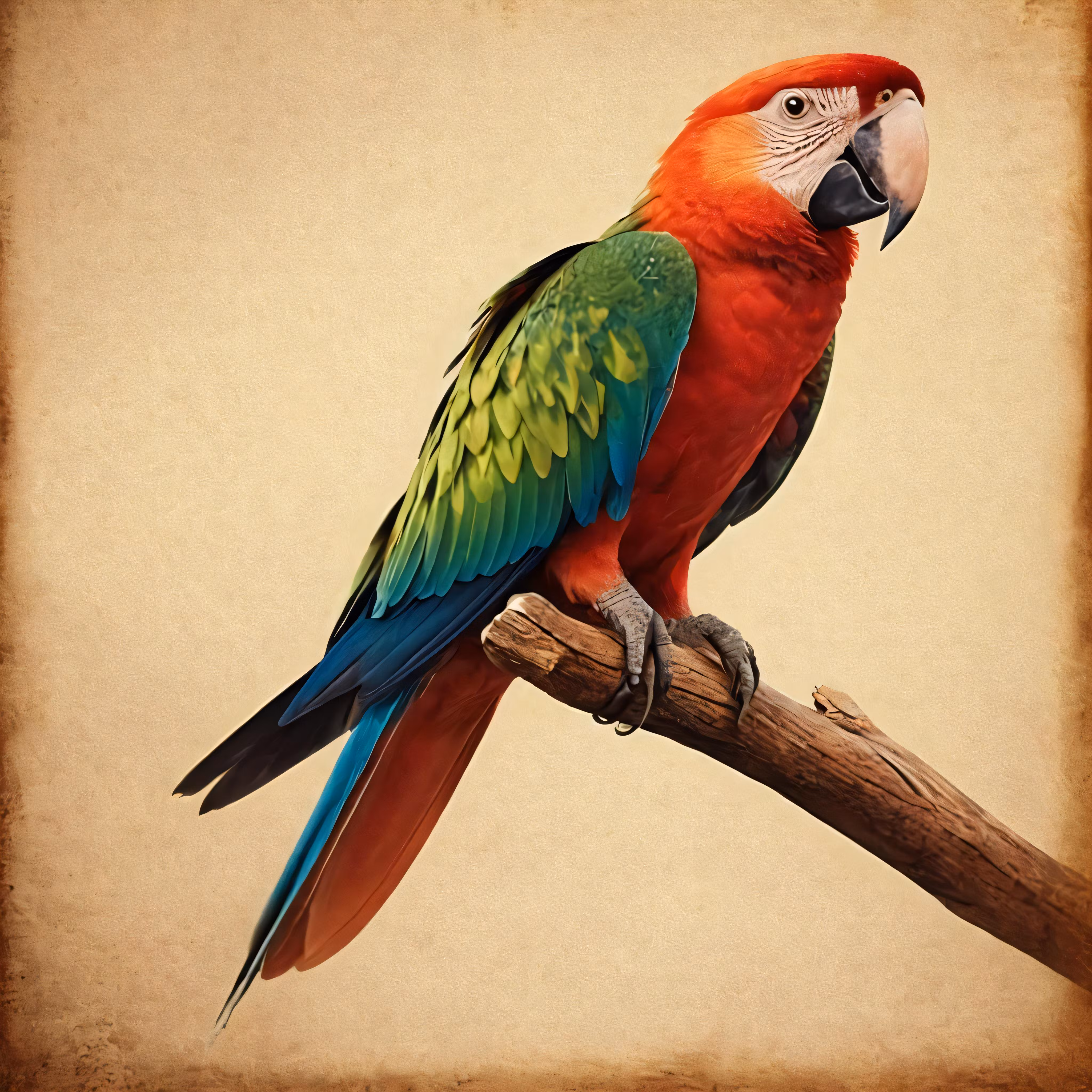 High resolution picture, free to use, colorful parrot perches on an old, worn branch