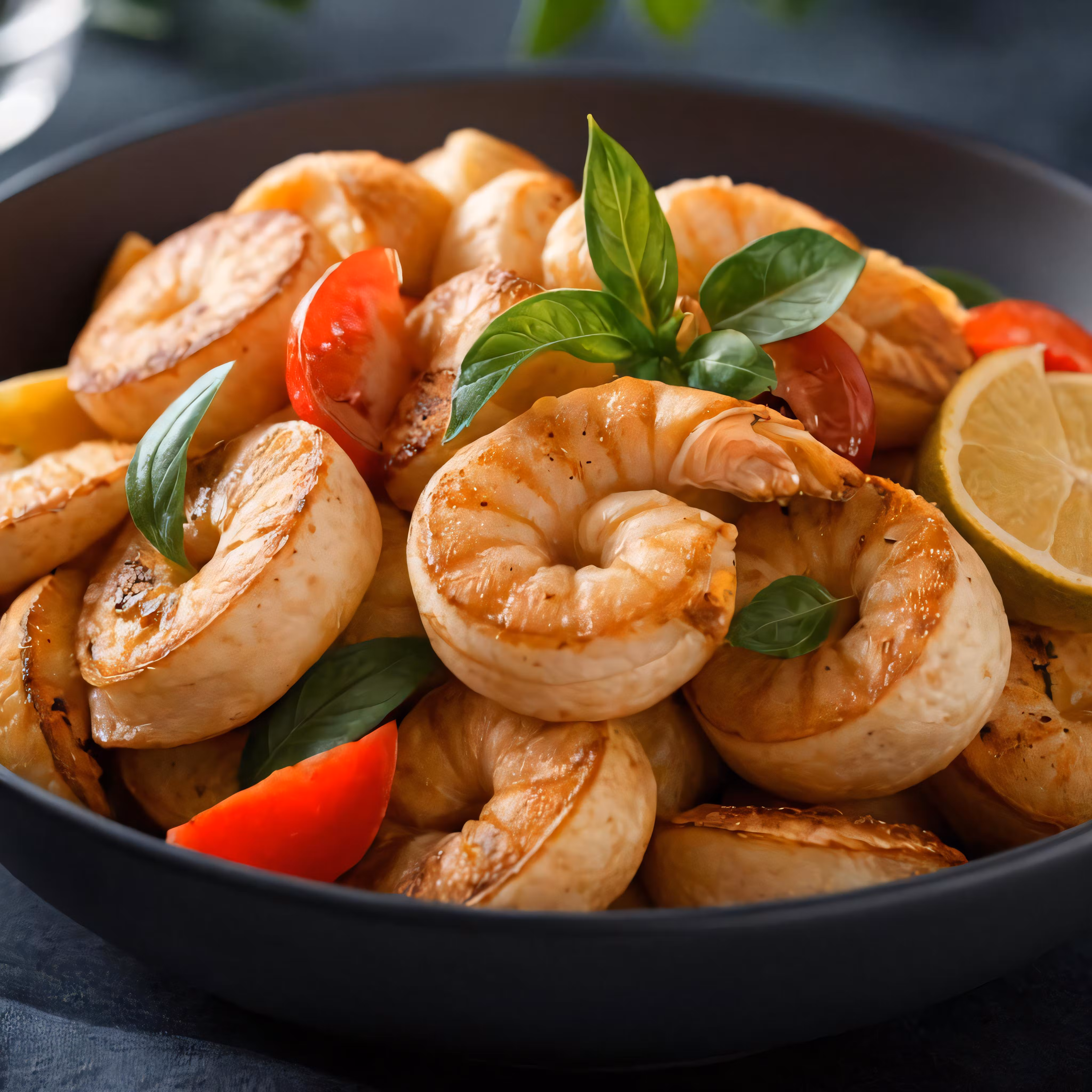 High resolution picture, free to use, cooked shrimp with fresh basil and sliced lemon