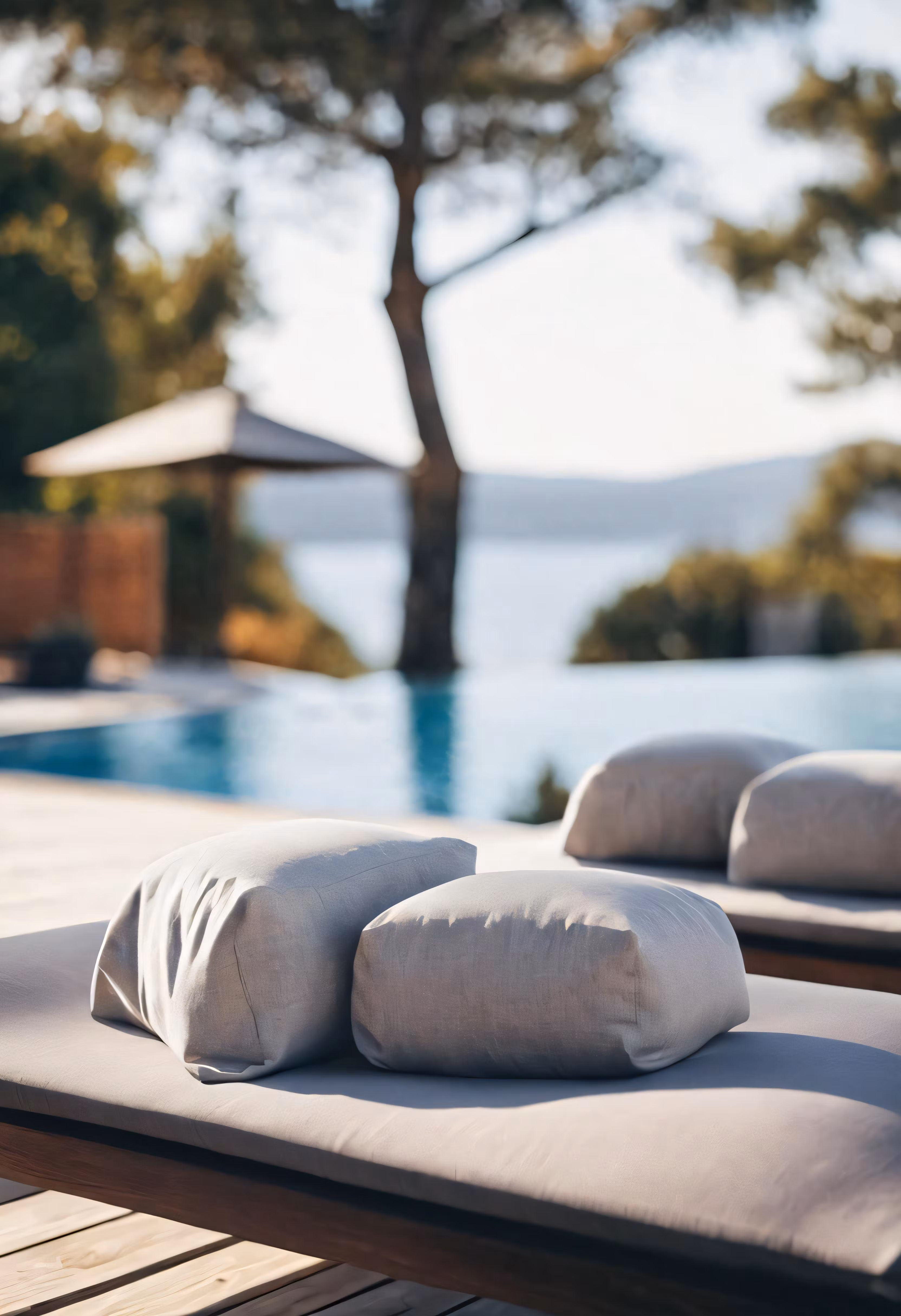 High resolution picture, free to use, cushions in the shape of two heads rest on a chaise lounge next to an outdoor swimming pool